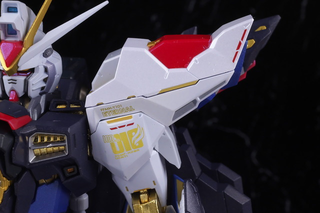 Around the waist. The markings on the right front armor and the molding in the center of the waist are gold, making it more flashy than the normal version. The gray color has also changed from the normal version.
