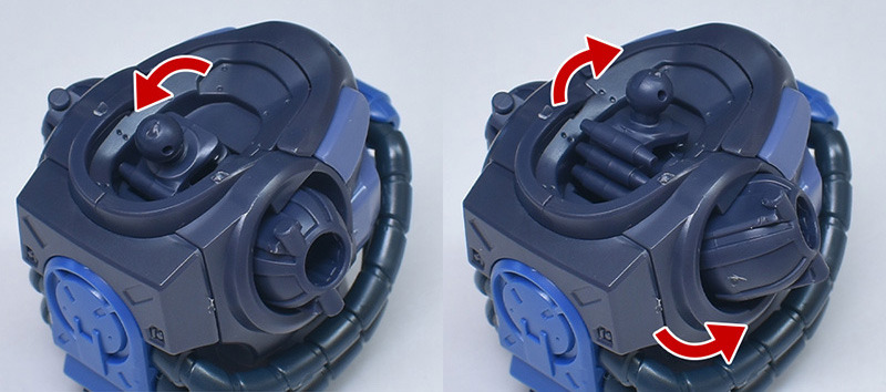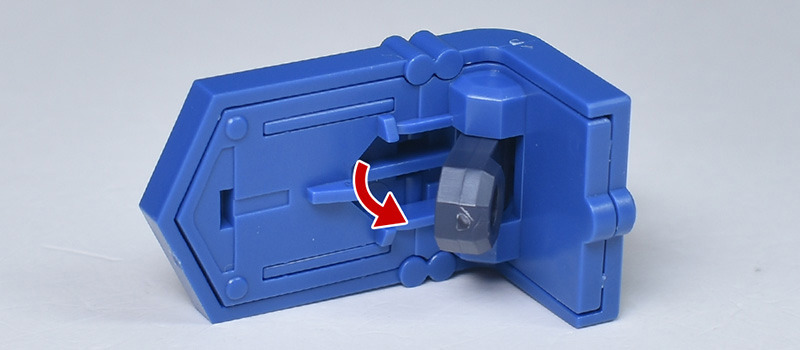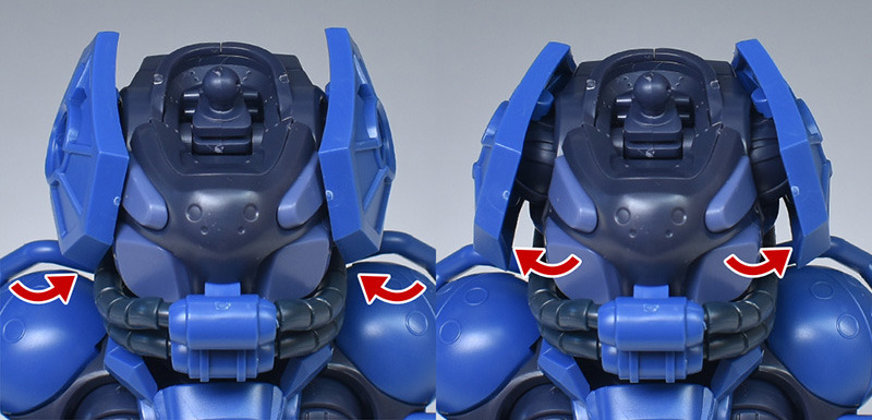 The left shoulder has a spherical armor like the old Zaku from the first series. As with the L-shaped shield, a patrol light is also molded on the top.
