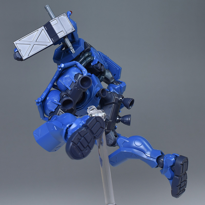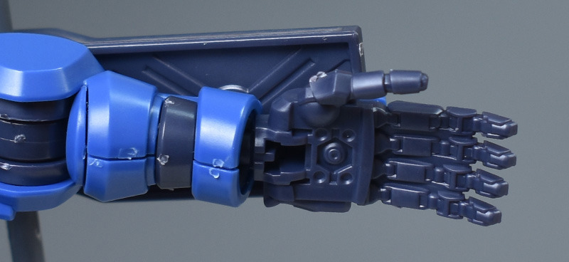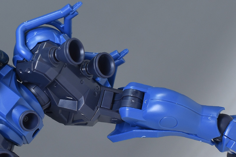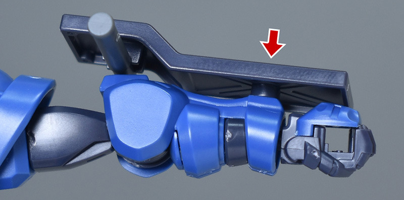 The L-shaped shield is small but well-reproduced, and the armor below the upper arm is cylindrical, giving it a Zaku-like feel.