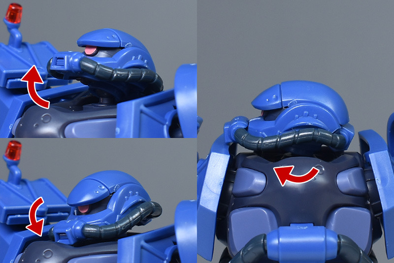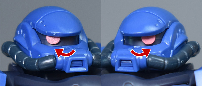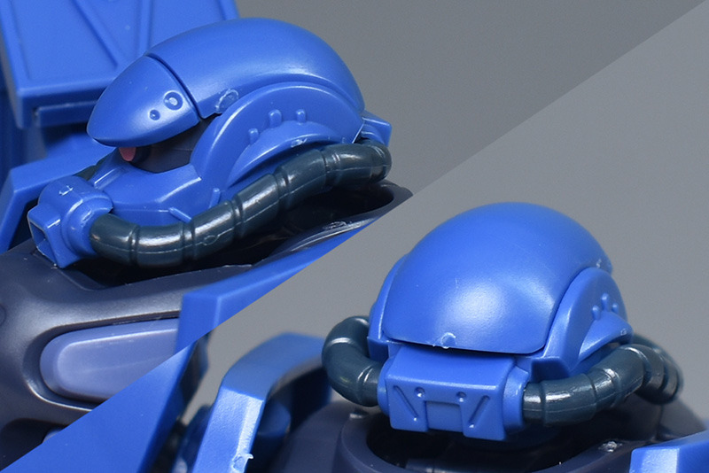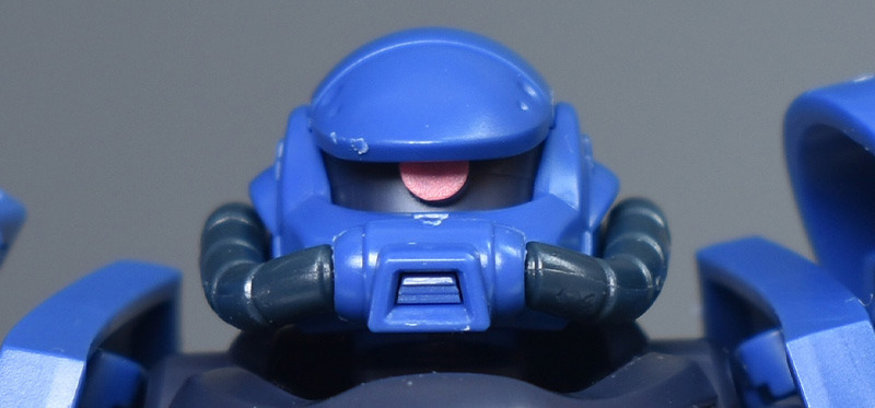 Head. The smooth, rounded helmet is a distinctive feature. It’s a unique design, but the ducts around the mouth and the power pipes on both sides give it a Zaku-like feel.