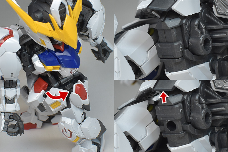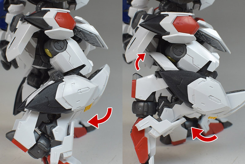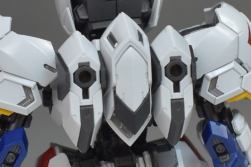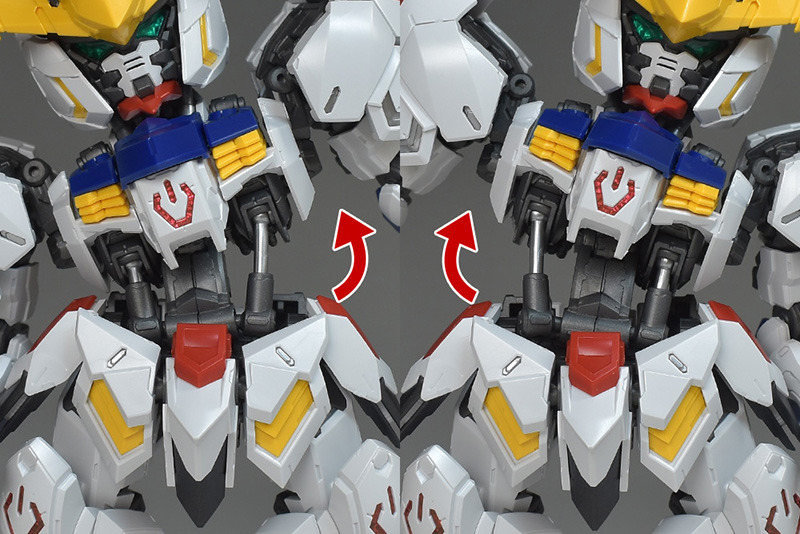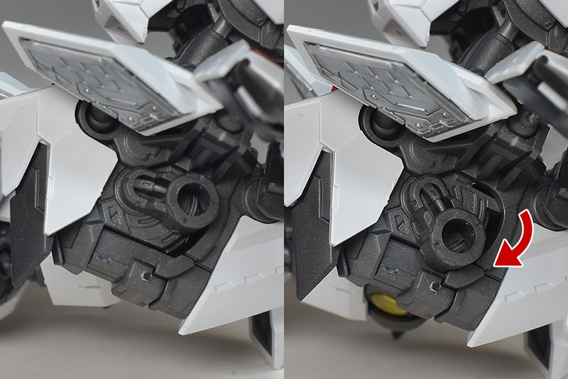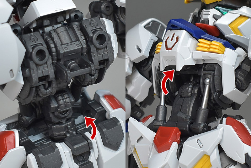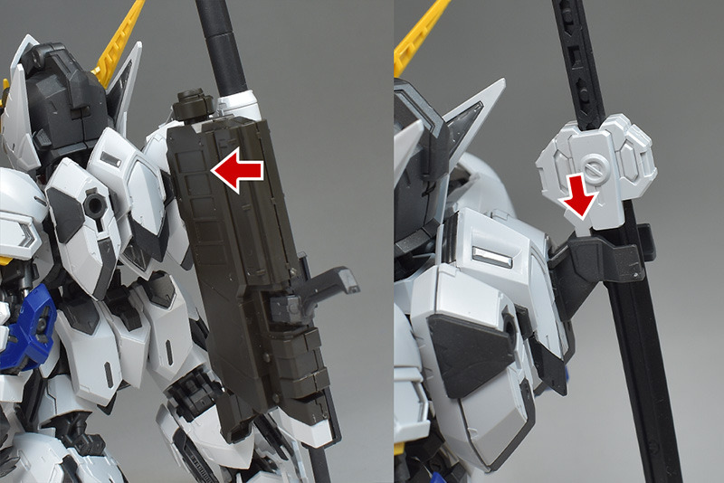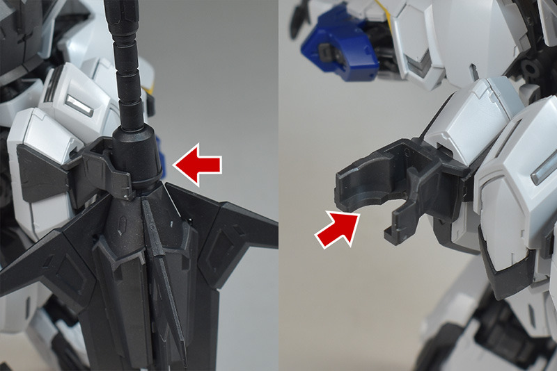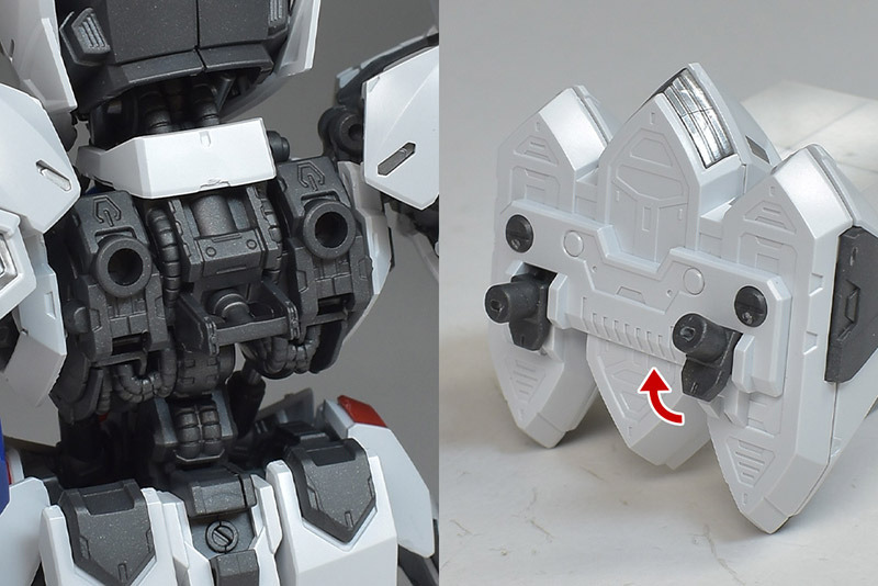 バックパックはバルバトス本体に2ダボ接続でしっかりと組み付けられますが、ただのダボ固定ではなく、可動ギミックによって少し上下します。