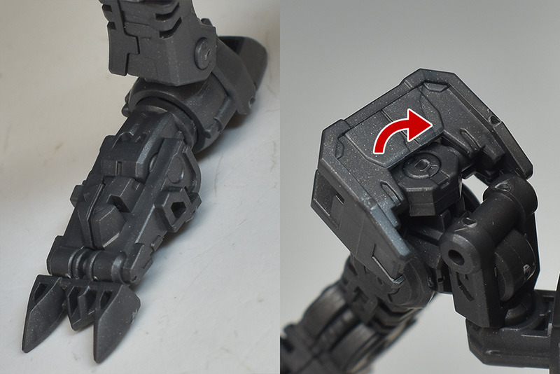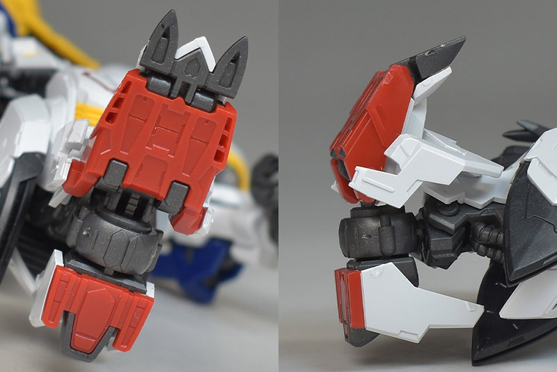 膝は通常だとくの字程度まで曲がりますが、更に深くまで曲げると後部装甲が可動して干渉が避けられ、より深くまで曲げられるようになっています。またその際には、前面の装甲がスライド展開して内部のフレームが露出するというこだわりよう。