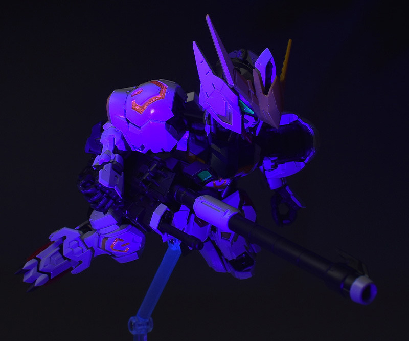 The clear green parts, such as the twin eyes and the smoothbore gun sensor, glow slightly when illuminated with a black light. The clear pink parts with reflective cut also glow under black light.