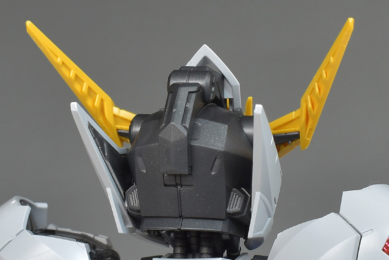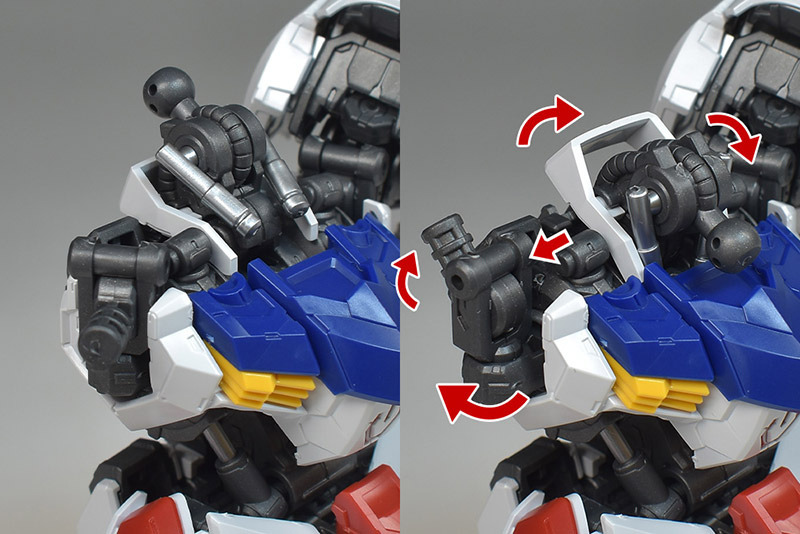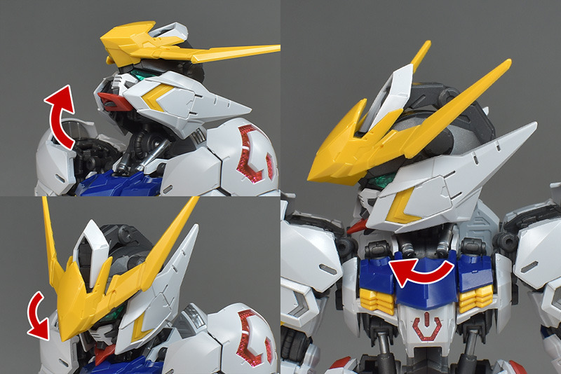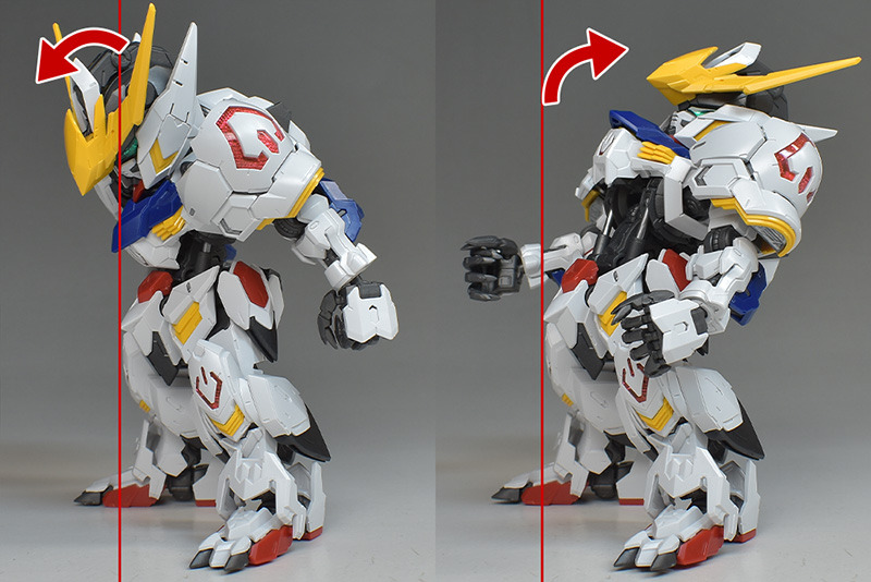 首には細かな可動ギミックがあるので、頭部はかなり幅広く上下させることができます。バックパックを外せば更に広く展開可能。左右へも干渉なくスムーズにスイングさせることができます。