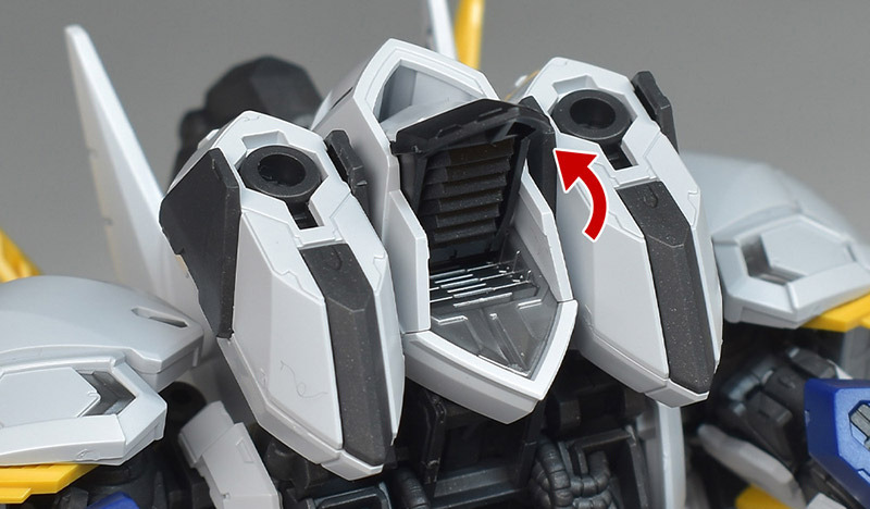 中央のスラスターは適度に展開可能。展開口はスリット状の段差モールドで見栄え良く造形されています。内側はシルバーのリアルメタリックグロスインジェクションでメカニカルに造形。