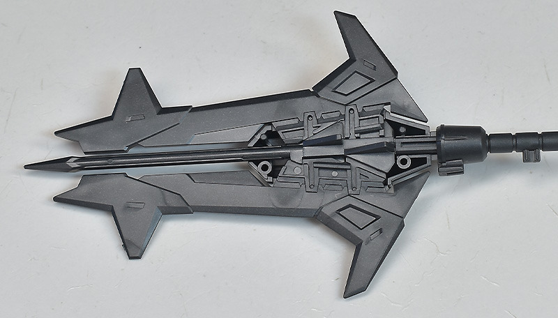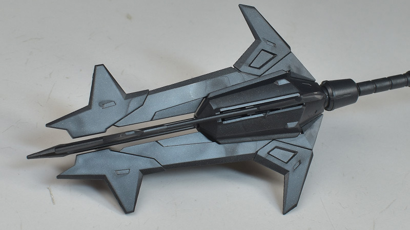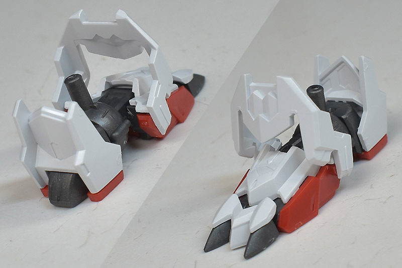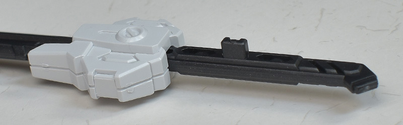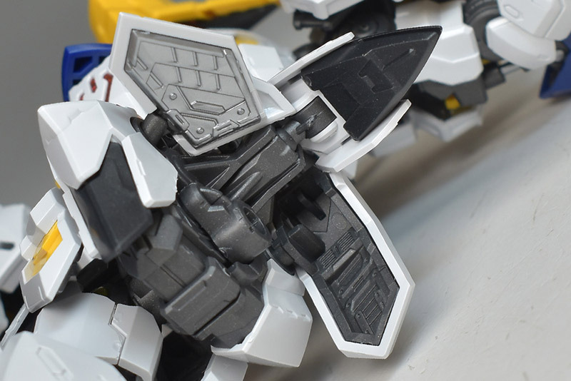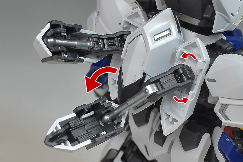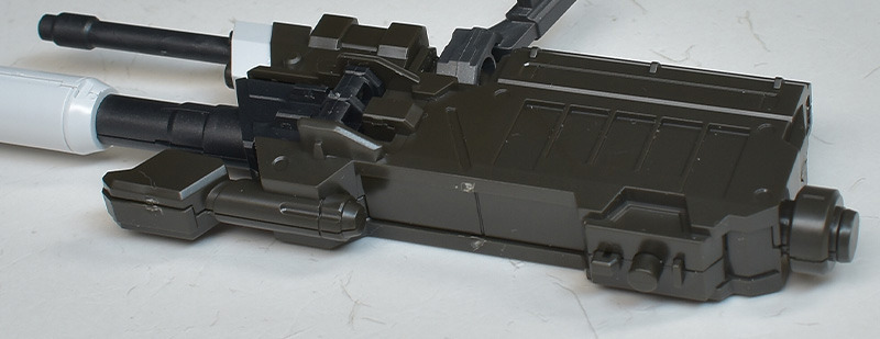 バックパックの装甲は内部のアームによって幅広く展開可能。ウェポンラックとして機能します。基部はロール可能。MGのような上下へのスライドギミックはありません。アームは基部はしっかりと固定されていますが、ヒンジ接続部は少し外れやすいかも。アームはシルバー成型色での再現。