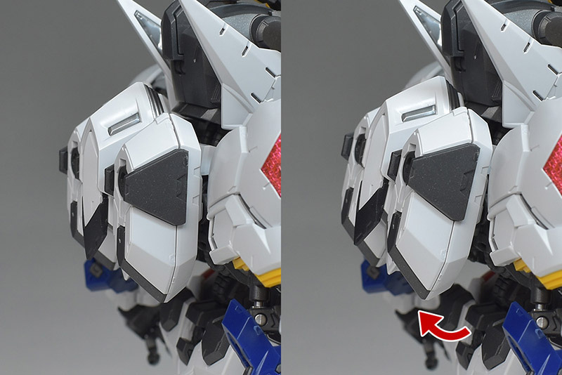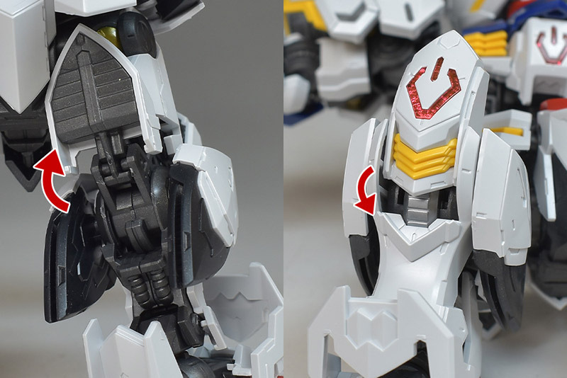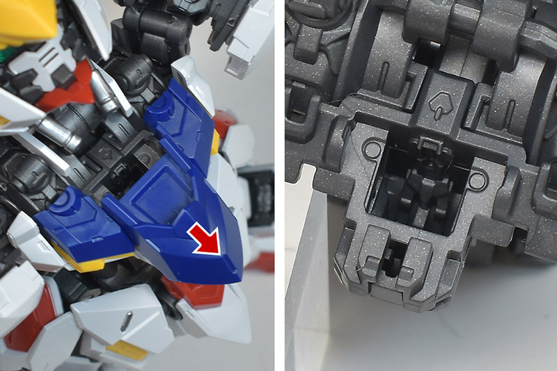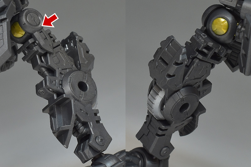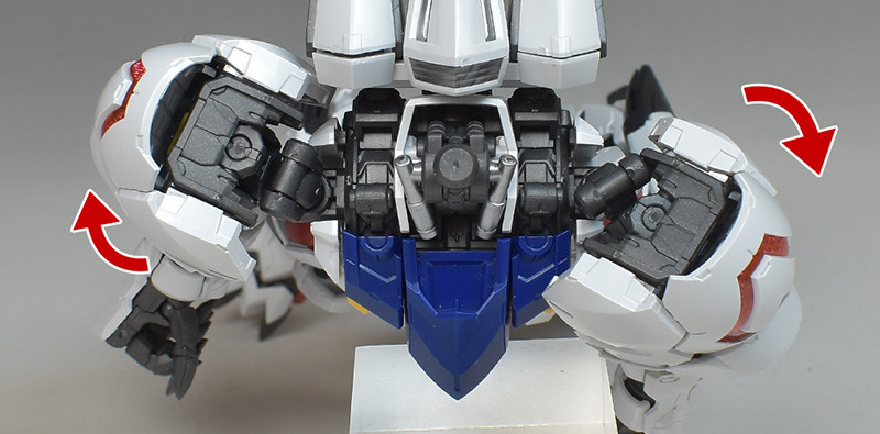ショルダーアーマーは裾の装甲を引き出すことで、マーク部分の装甲も連動して引き出されます。装甲が展開することで内部のシルバー成型色パーツが露出。側面の隙間もシルバーの装甲で厚みが出してあるという出来の良さ。