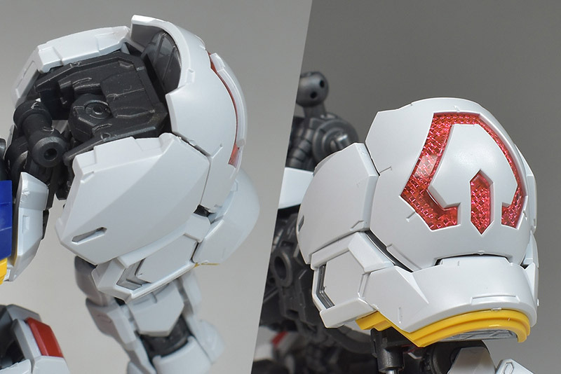 ショルダーアーマーもメカニカルに造形。ふちのスリットモールドや前後のシルバーのスリットダクトなどもパーツで細かく色分けされています。側面のマークはクリアピンク成型色のリフレクションカットパーツ。点のようなモールドが多数造形され、光が当たるとキラキラ反射するような演出を楽しむことができます。