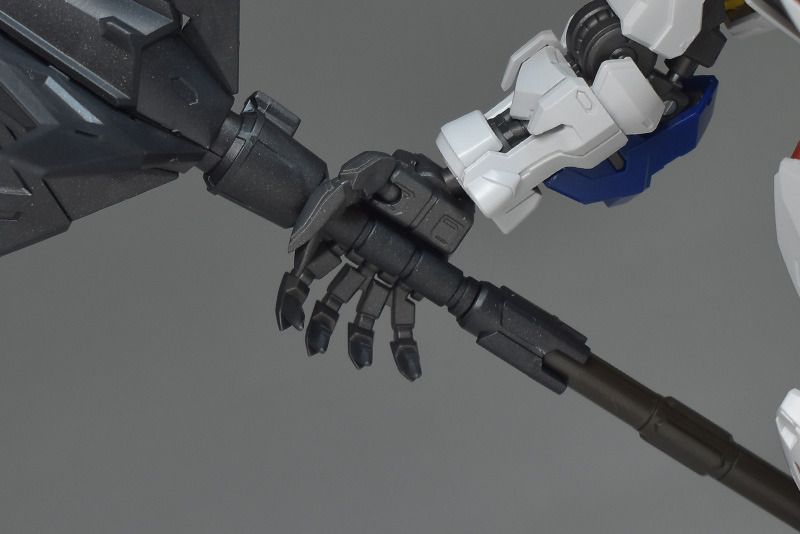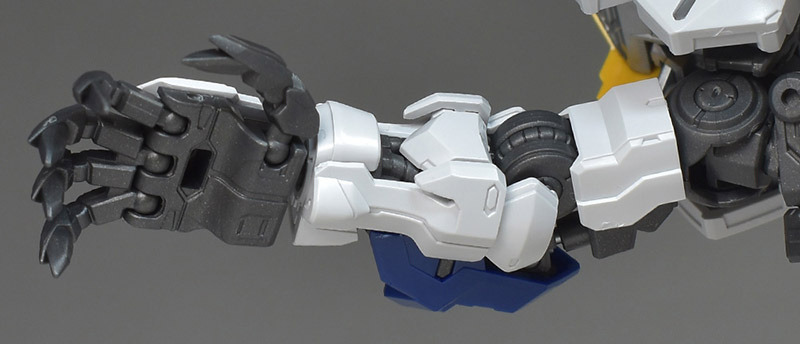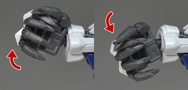 The Gundam frame is partially assembled with exterior parts, so there are no seams. The hand parts are a type where the thumb, index finger, and the remaining three fingers can move individually. There are two ball joints on the three fingers, so it seems impossible to separate all the fingers.