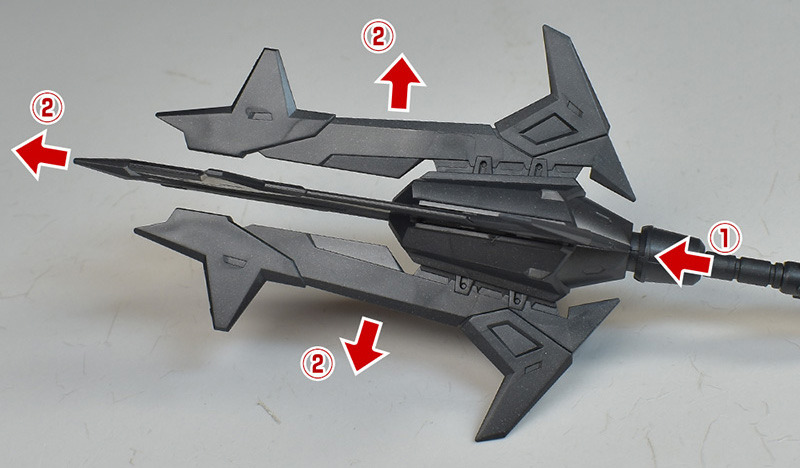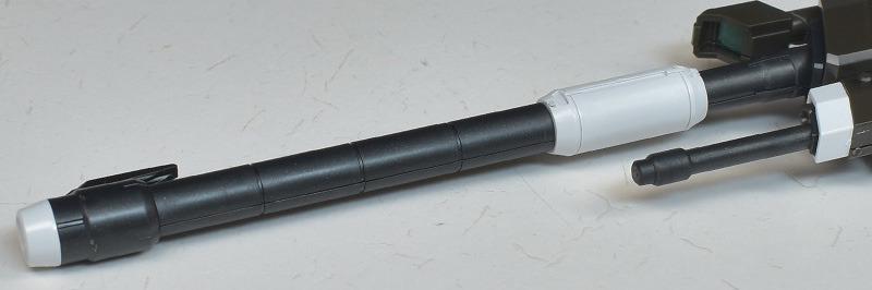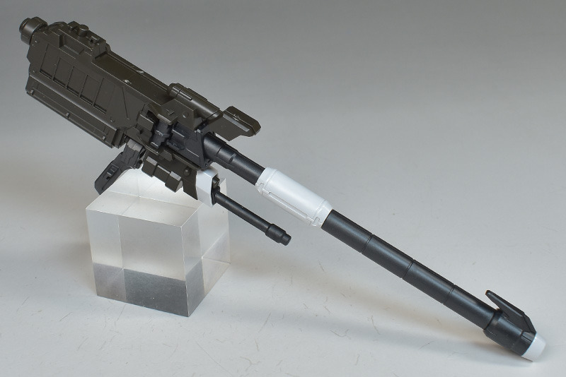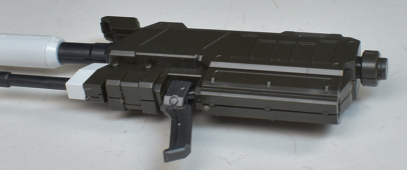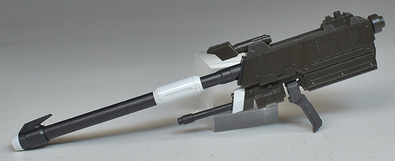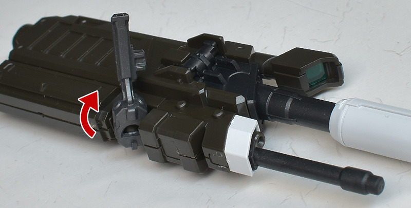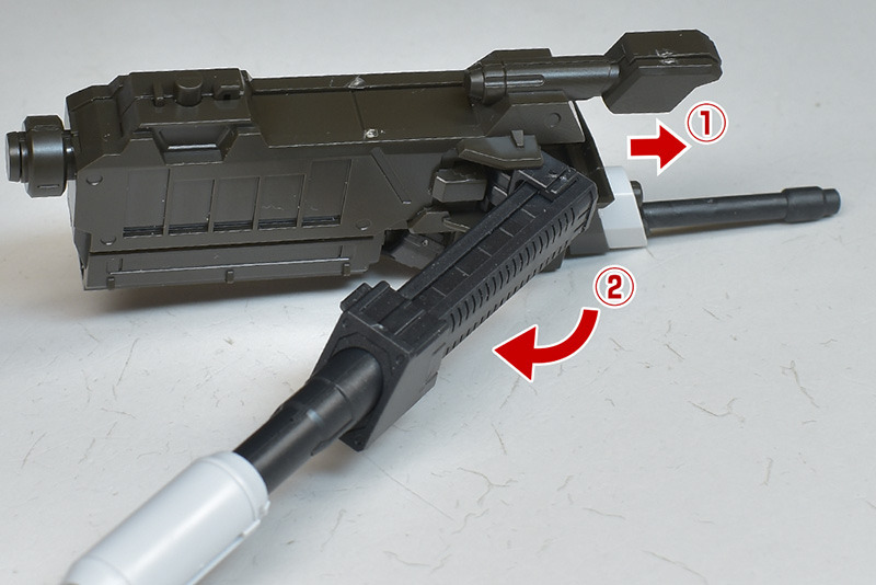 1/100やMGにあるギミックと同様、滑腔砲はコンパクトに折りたたむことができます。まずは①本体部から砲身を引き出し、②接続部分を折りたたみます。