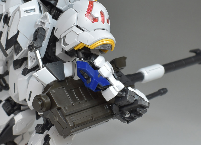 The molding color is based on white, with blue on the chest and elbows, red on the jaw, waist and sole, and yellow on the head antenna and various ducts, giving it a Gundam look. The internal Gundam frame and weapons are reproduced in a metallic dark gray molding color.