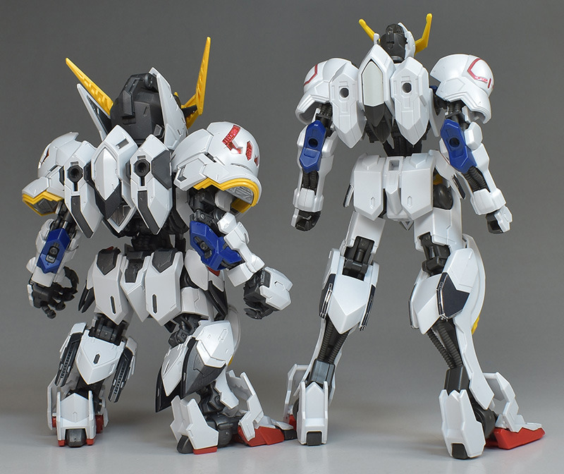 HGガンダムバルバトスと並べてサイズを比較。大きさはHGと同じくらいですが、頭身が異なるため、並べると大きな子供のような不思議な感じがありますね。