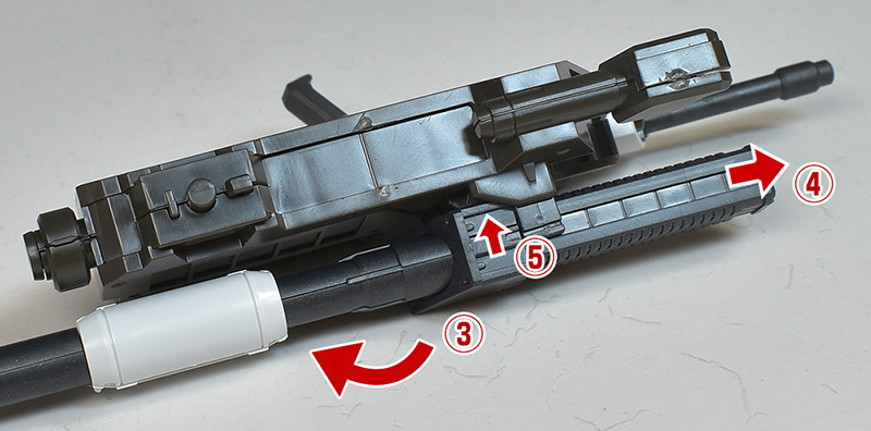 そして③④スライドした部分を戻し、⑤砲身を本体部側面に組み付けて固定します。これで折りたたみ完了。