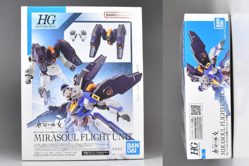 The HG Mirasoul Flight Unit Equipment is a 1/144 scale model kit of the Mirasoul Flight Unit equipped on the Gundam Aerial in Mobile Suit Gundam: The Witch of Mercury. The distinctive unit shape is reproduced with new molding. In addition to the side thruster exposure gimmick, the kit also allows for a saber grip (saber handle) to be attached inside. It also comes with an expressive open hand for the HG Gundam Aerial (sold separately). The price is 880 yen (tax included).