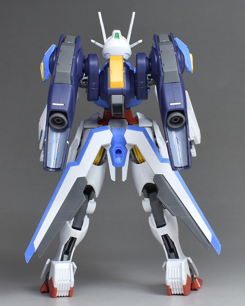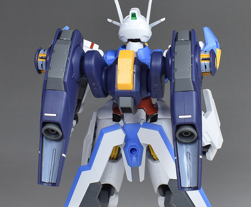 Flight unit. This is a vertically long flight unit with a highly designed design. The thrusters on the sides and the gray armor on the top are finely colored with parts, giving it a high level of completion. Partial line molding is colored with white stickers.