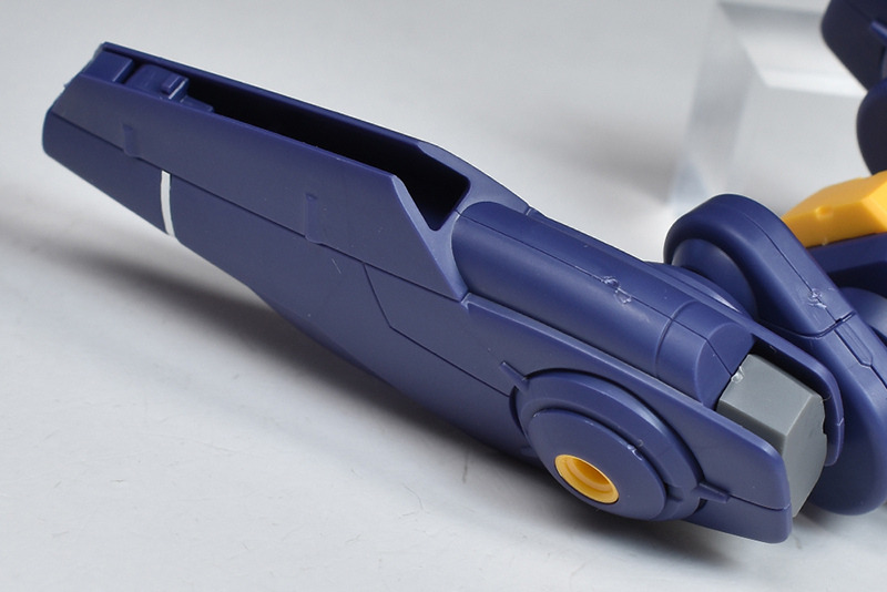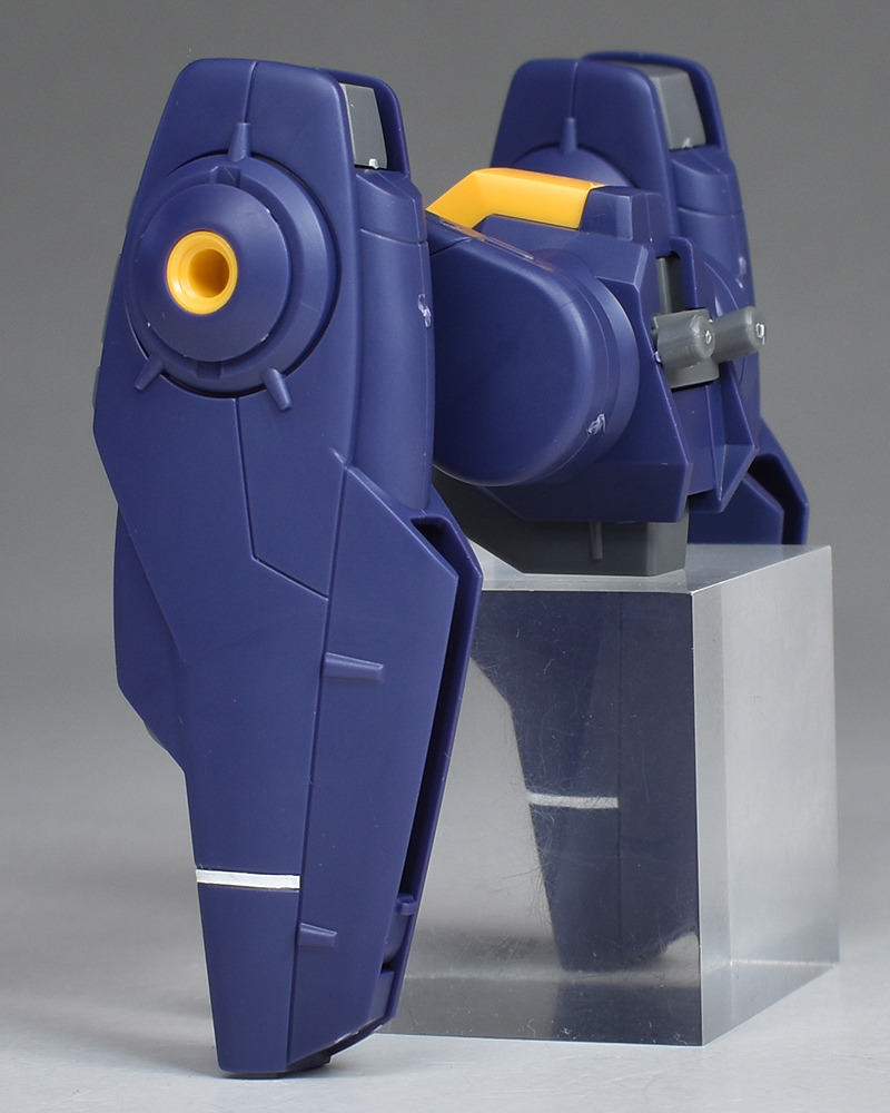 The central backpack is a compact box type. The left and right sides are joined together in a structure of dark blue armor, which creates a small seam at the edge. It seems like it would be a pain to assemble it later, so it might be better to carve a step-down mold on the other side as well. There are no slits inside the lower thruster. The edges need to be painted yellow.