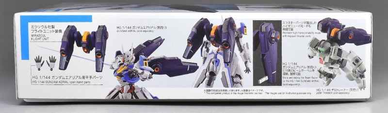 The package illustration shows the Gundam Aerial and Demi-Trainer kits equipped with MiraSoul flight units, along with all the contents. The Aerial has the back unit deployed, and the included open hand expression.