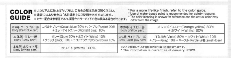 The molding color is dark blue with yellow and gray coloring on various parts. The inside of the central thruster needs to be painted yellow, the inside of the unit vernier needs to be painted dark gray, etc., but the color separation is reproduced sufficiently even with unpainted assembly.