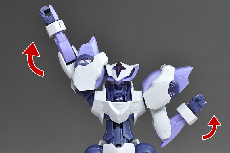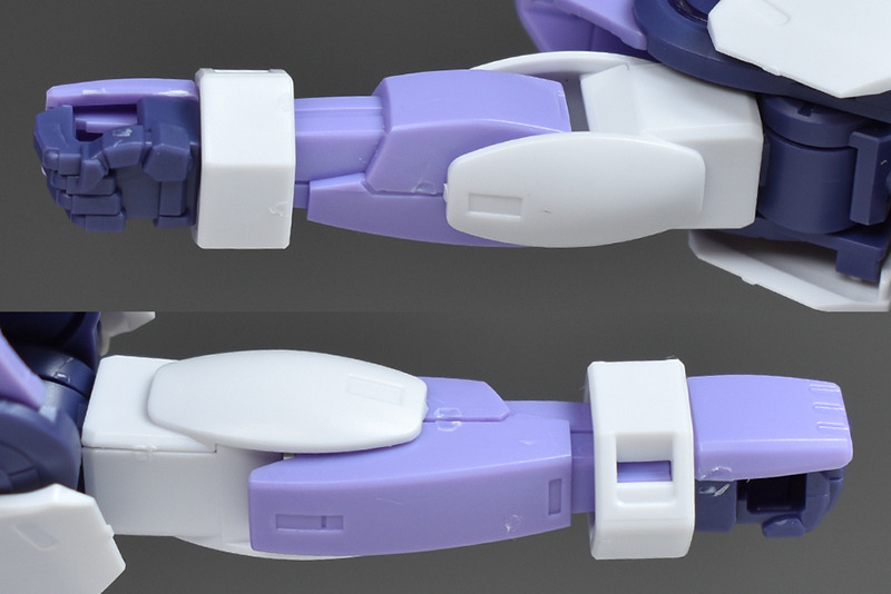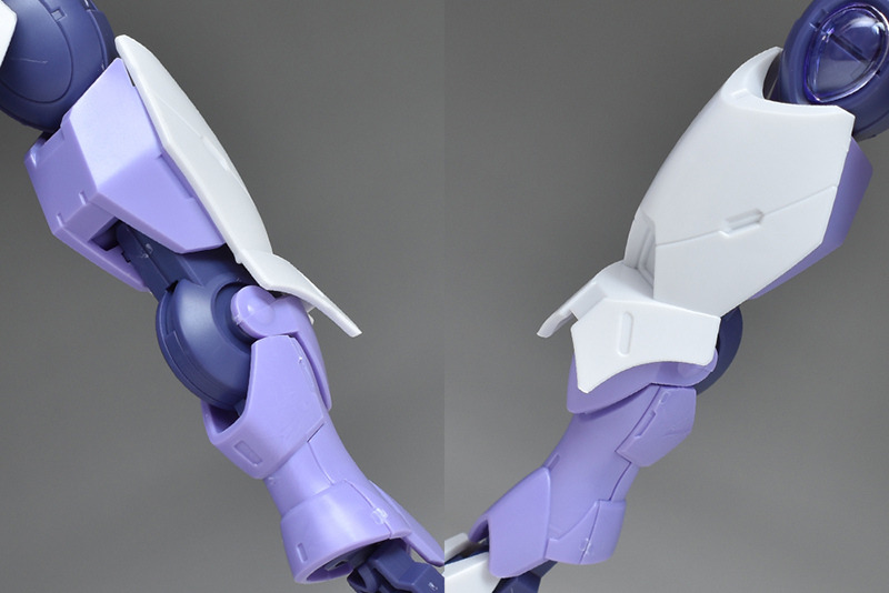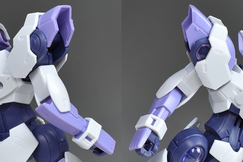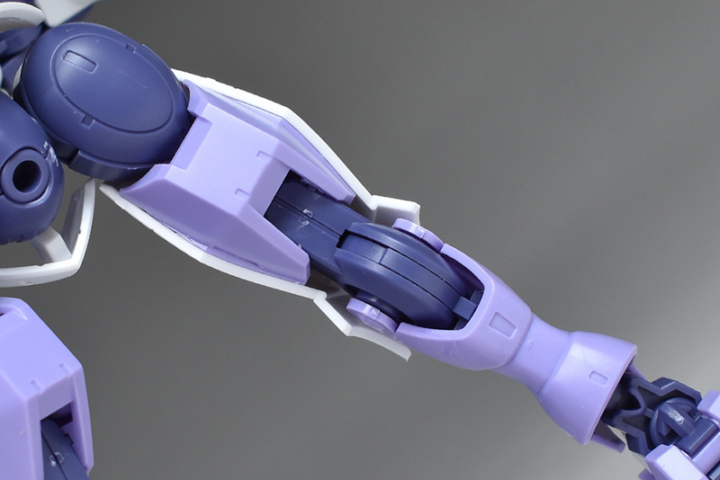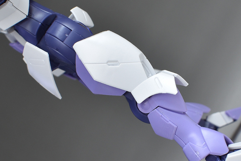 Arms. The shoulder armor is quite prominent, but the arms below are slim and lightly armored. The white armor on the wrists is color-coded into inner and outer parts.