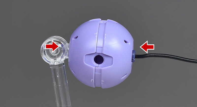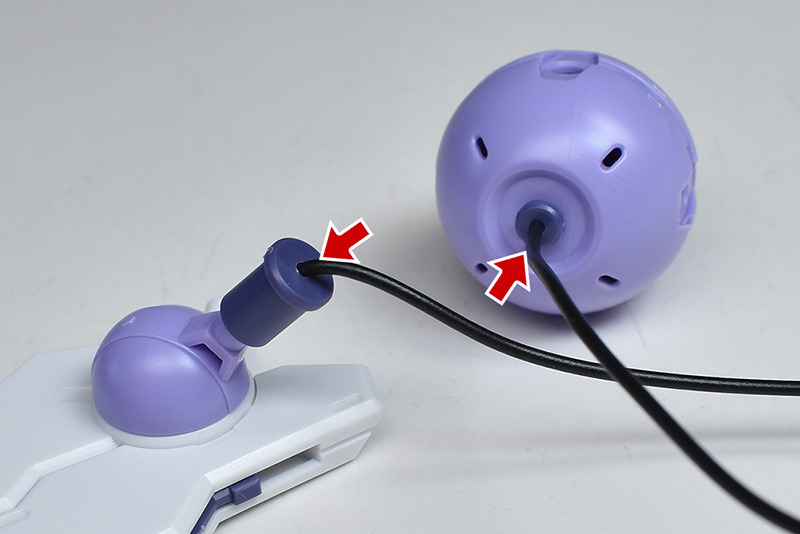 By using the included wired parts, you can recreate the ejection state of the Non-Kinetic Pod. The wired parts consist of lead wires and joint parts. Be careful not to pull out the joint parts inserted into the Non-Kinetic Pod, as the lead wires will come out. Grab the parts and pull them out.