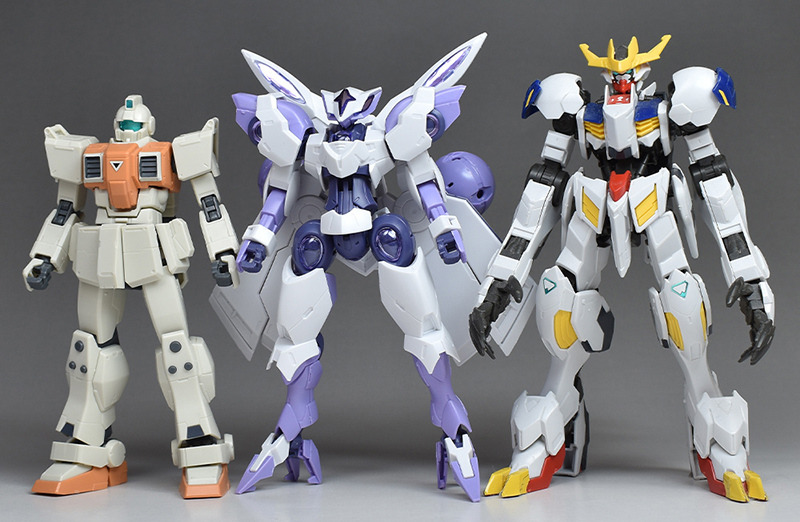 Comparing the size with the HG Ground Type GM and HG Lupus Rex. The Begilbeu itself is not much different from the Land GM, only slightly larger. The backpack on its back makes it look a little larger. The Begilbeu is 18.3m tall.