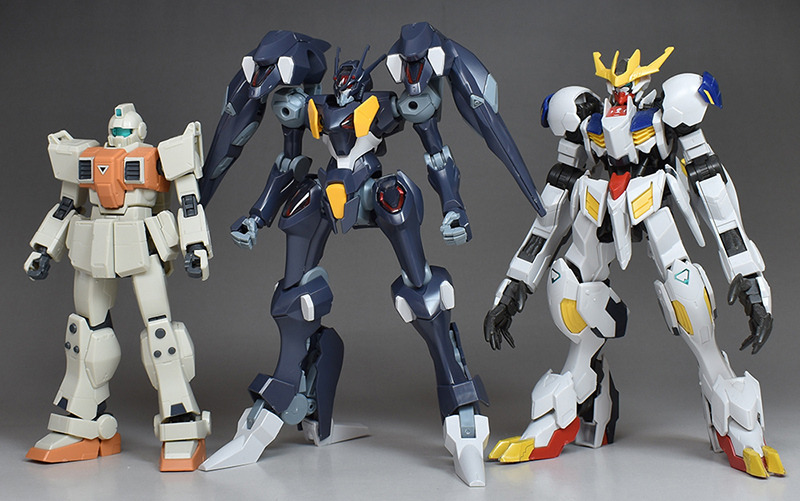 HG陸戦型ジム、HGルプスレクスと並べてサイズを比較。頭頂高自体はルプスレクスと同程度ですが、肩にバックブースターを装備していることでやや大柄になっています。ガンダムファラクトの全高は未定、頭頂高は19.1mです。