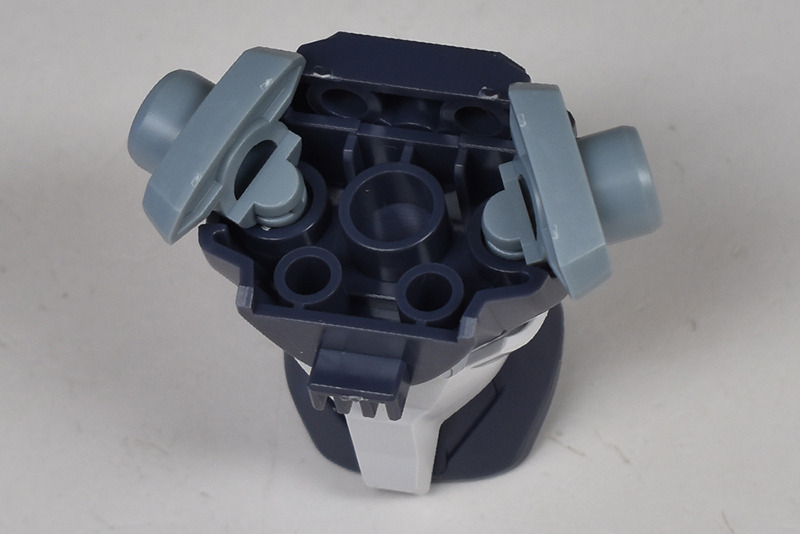 側面の装甲は薄型のウイングタイプ。外側のスラスター口は別パーツ化され、内側には2基のガンビット『コラキ』が格納されています。装甲は前後の組み合わせですが、側面の合わせ目は段落ちモールド化。