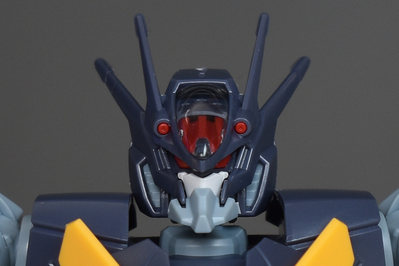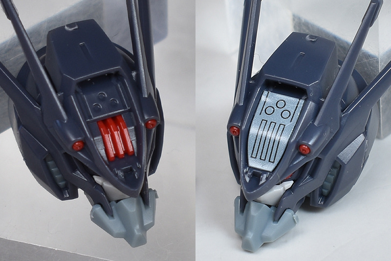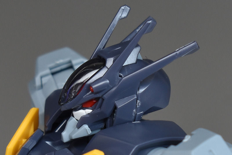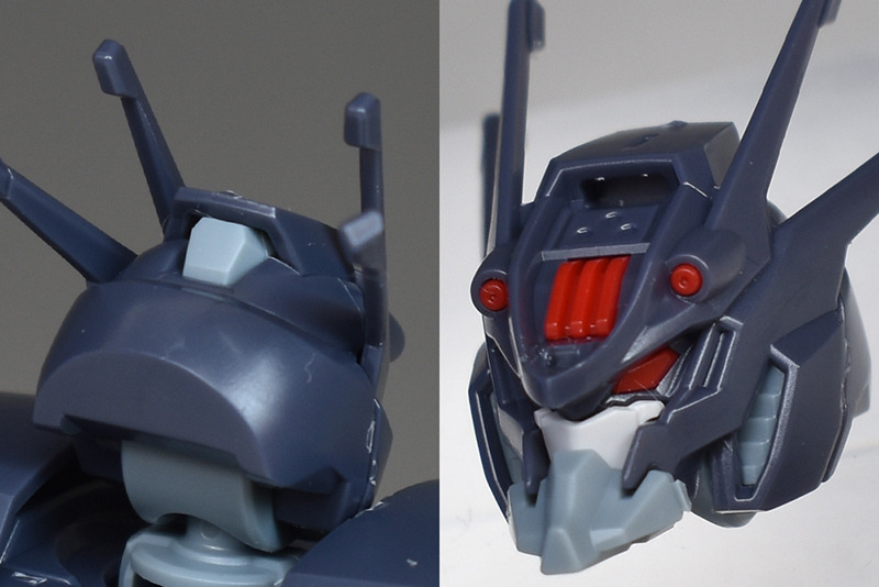 The head features four antennas and twin red eyes. The overall design is dark blue-gray, giving it a strong demonic feel. The shell unit on the forehead, the beam vulcans, and even the twin eyes are all color-coded in detail, which is impressive. There are many small parts, and many areas that require caution when cutting, so care should be taken.