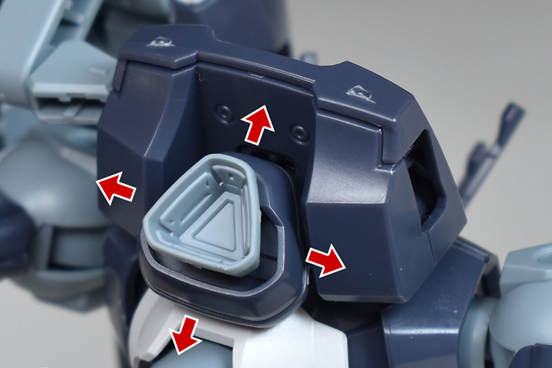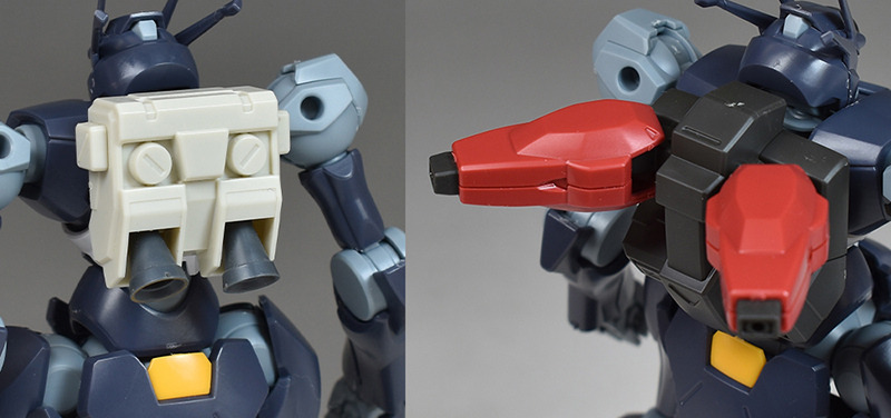 The backpack itself is made up of two parts, an upper and lower, and is a lightweight type with only one thruster molded at the rear. The inside of the thruster is molded in detail as a separate part, and it can be rotated appropriately by connecting it to a ball joint.