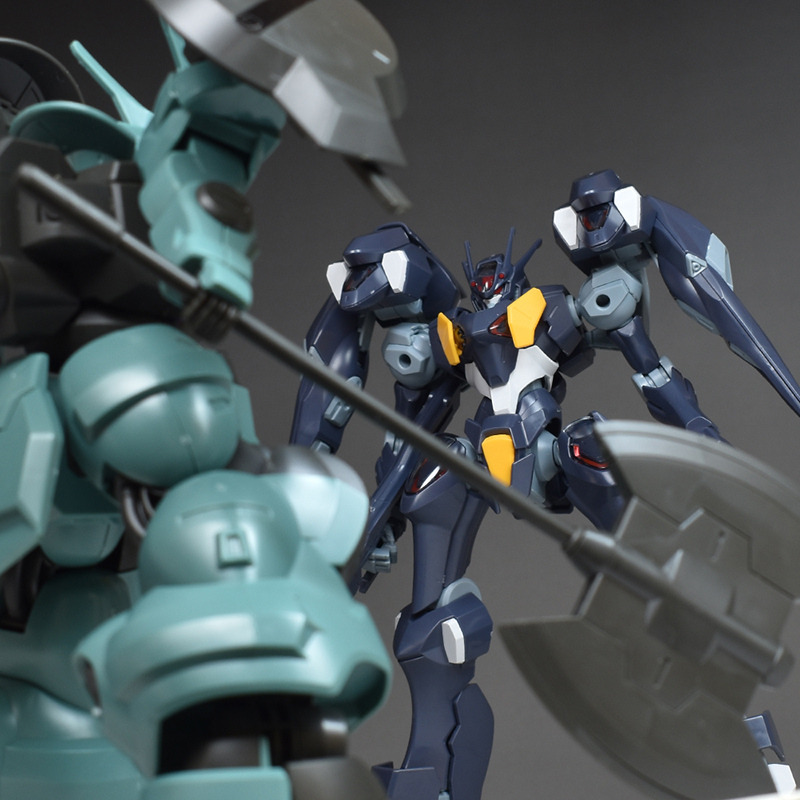 劇中で決闘を繰り広げたHGガンダムエアリアル、HGディランザ(一般機/ラウダ専用機)と並べて。※ディランザはラウダ専用機として組んでいます。スレッタとエランの強化人士4号との決闘やその後の展開は涙なしでは見られない印象的なシーンでした。