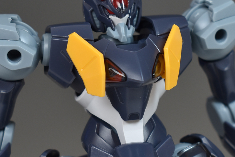 The molding color is a deep blue-gray base with white and orange-yellow accents on various parts of the body. In addition, the head is red, the shell units are clear black, and the joints and interior are gray, giving the figure a heel-like color scheme overall.