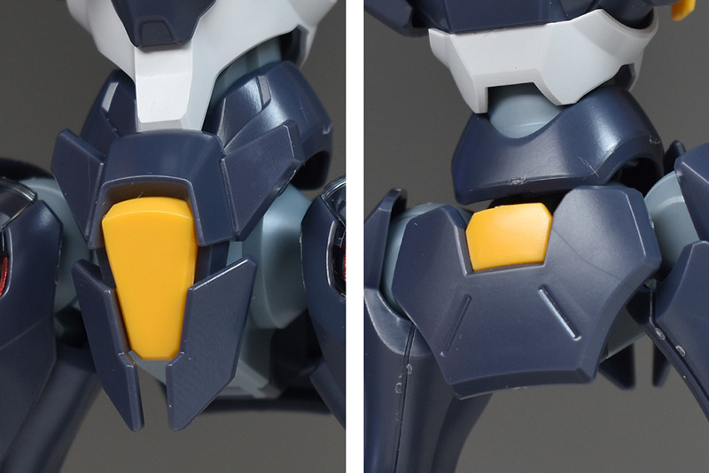 The chest is an inverted triangle. There are no slit air intakes, but the left and right sides are sculpted with shell units reminiscent of air intakes and yellow armor plates. The abdomen is also finished with white parts for an impactful look. The shell units are made with stickers attached, and then covered with clear parts.