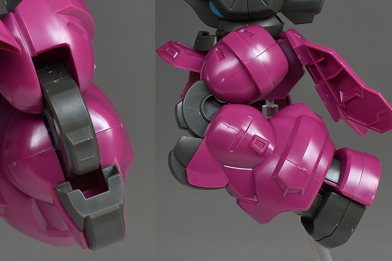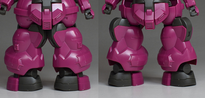 The thighs and lower legs are made of two pieces, front and back, with seams on the sides. The rear thrusters are molded in dark gray to recreate the color coding. The inside is open, making it easy to disassemble even when temporary assembly.