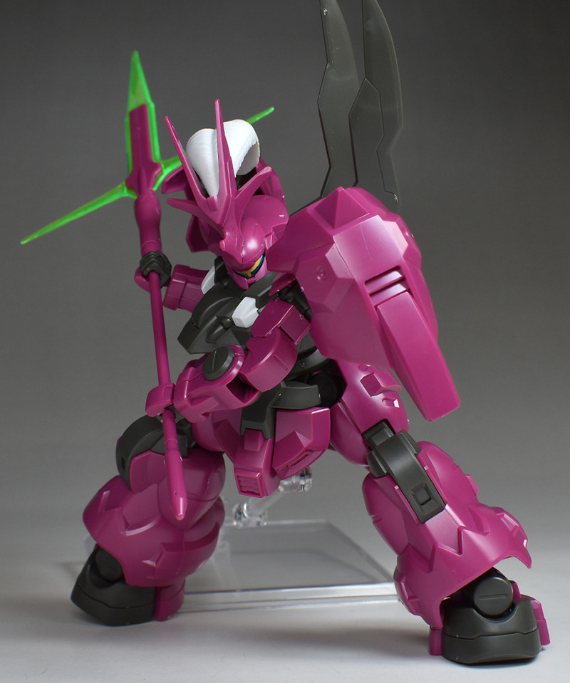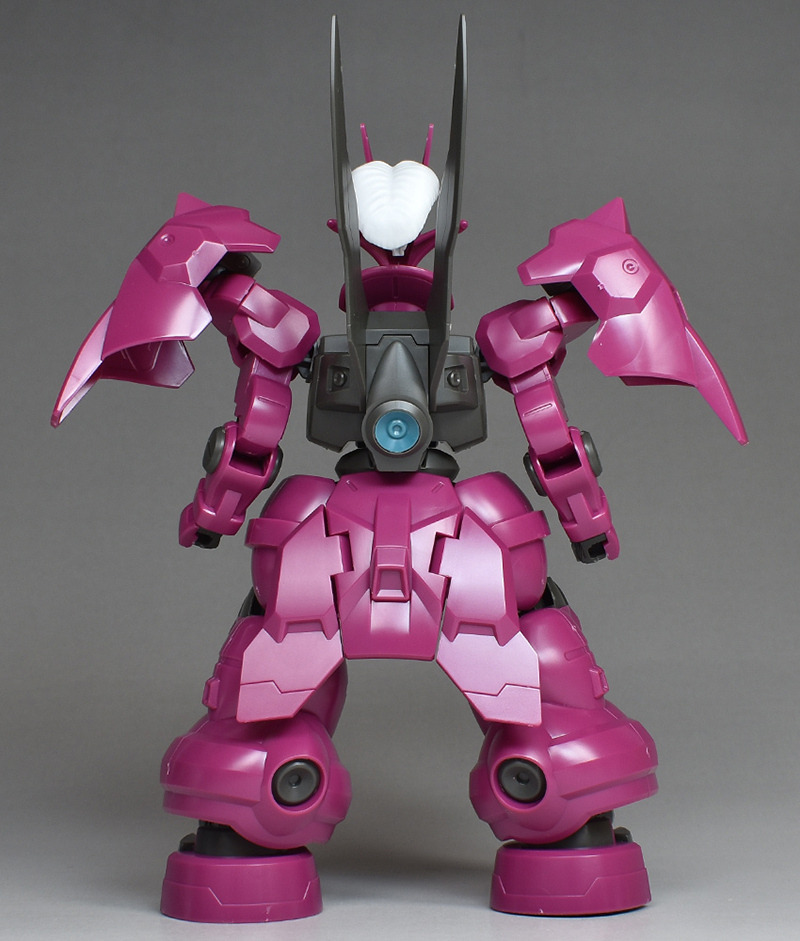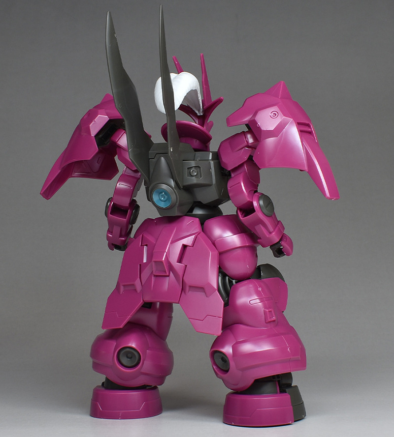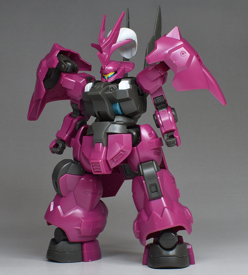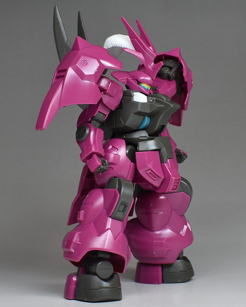 The MS “Dilanza” developed by Jetark has been tuned for the heir “Guell Jetark” to become the “Dilanza (Guell’s Custom)” in HG kit form. Its magenta-based coloring, massive proportions, and distinctive feathered blade antenna are all recreated.