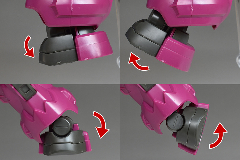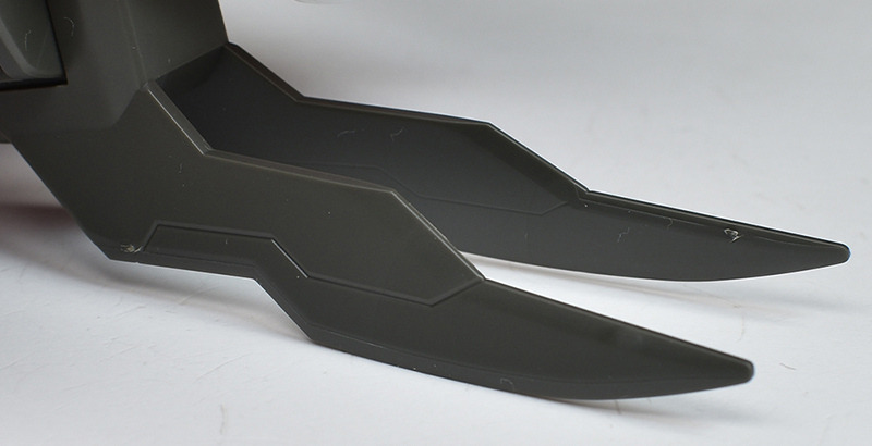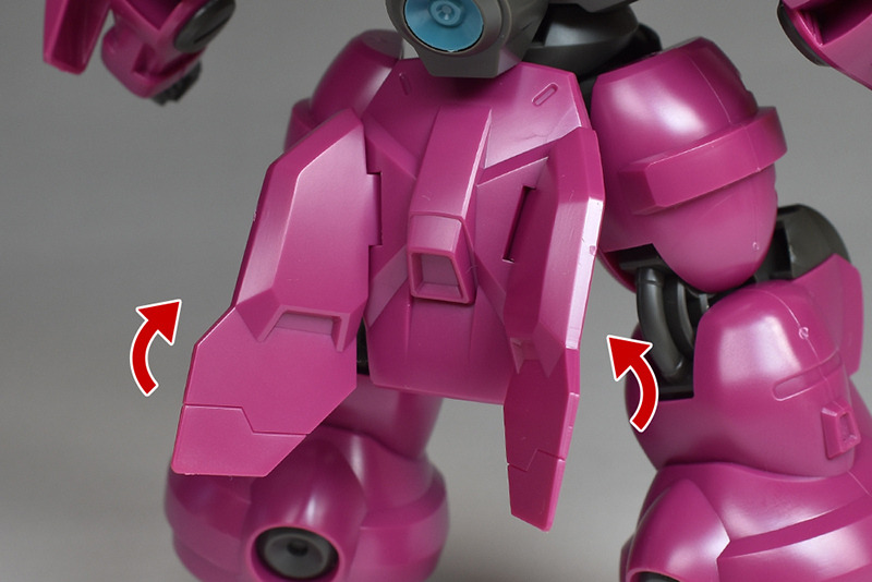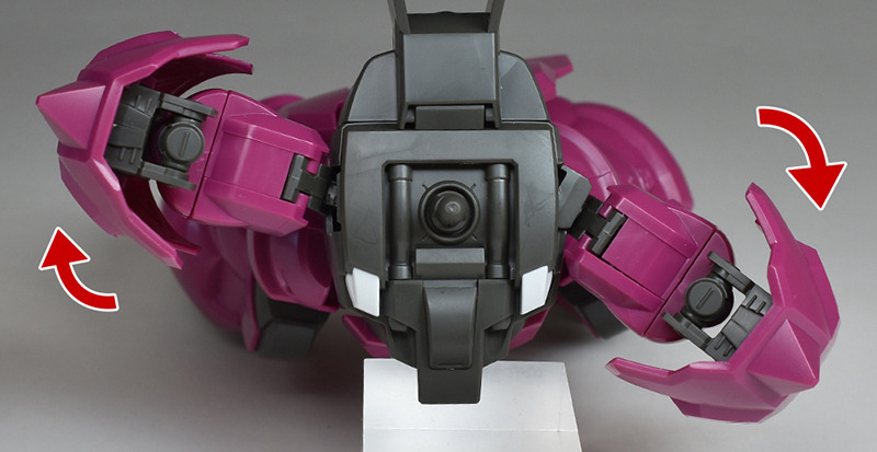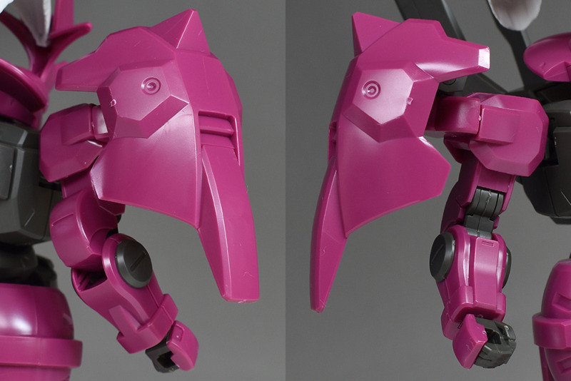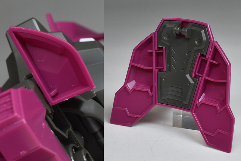The spike shield on the shoulder is made up of a single piece on the front. A simple backing part is molded on the back. The backing part has a holder that can be used to mount weapons, and the left shoulder can store a beam torch, and the right shoulder can store a beam rifle and magazine (E-pack).