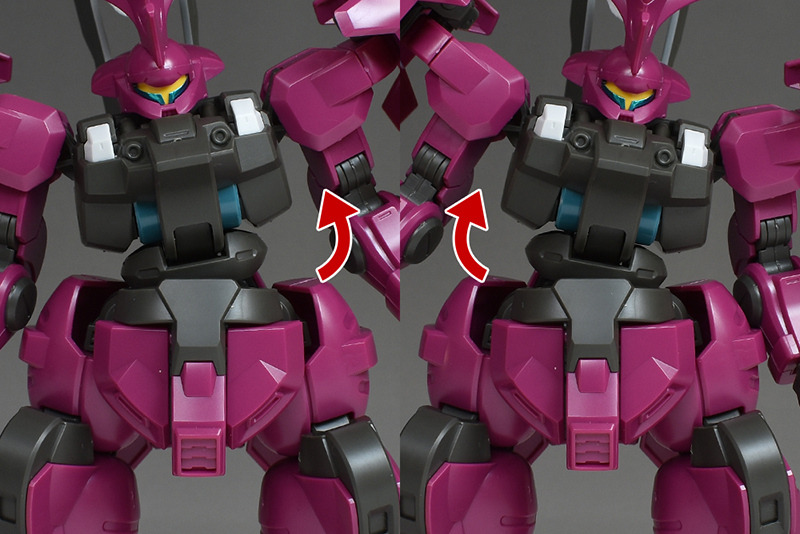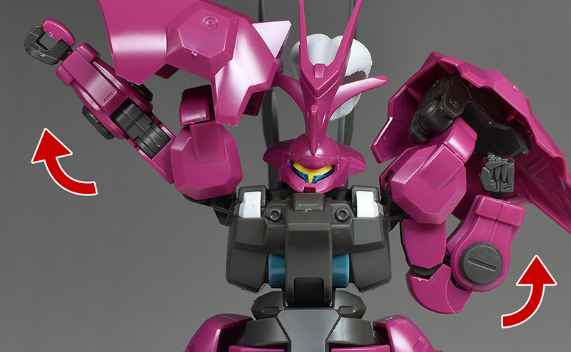 The arms can be deployed widely up to a Y shape. However, be careful as the spike armor can easily get in the way. The elbows are also double-jointed and can be bent deeply.