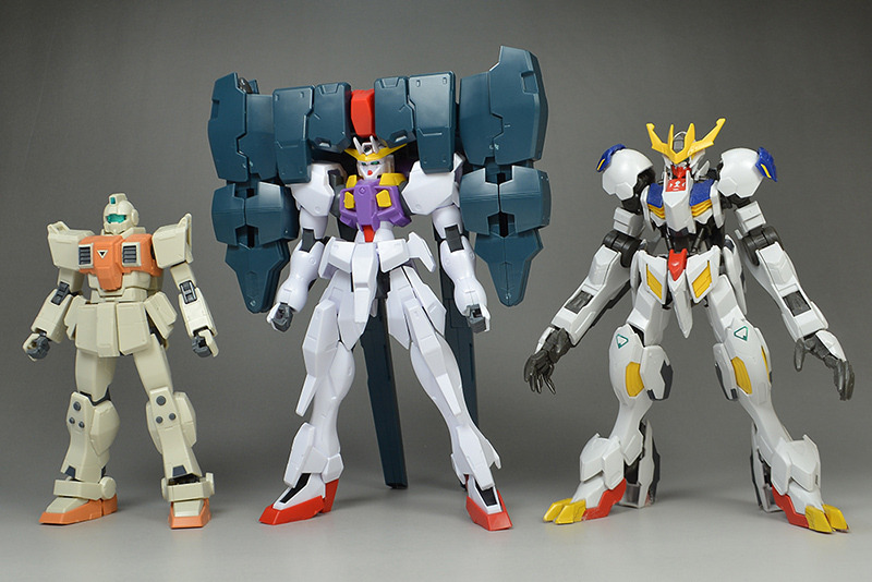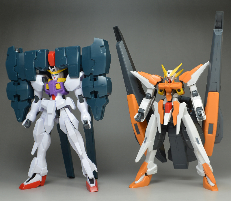Next to the HG Gundam Harute from the same series. Both are large and have unique body shapes.