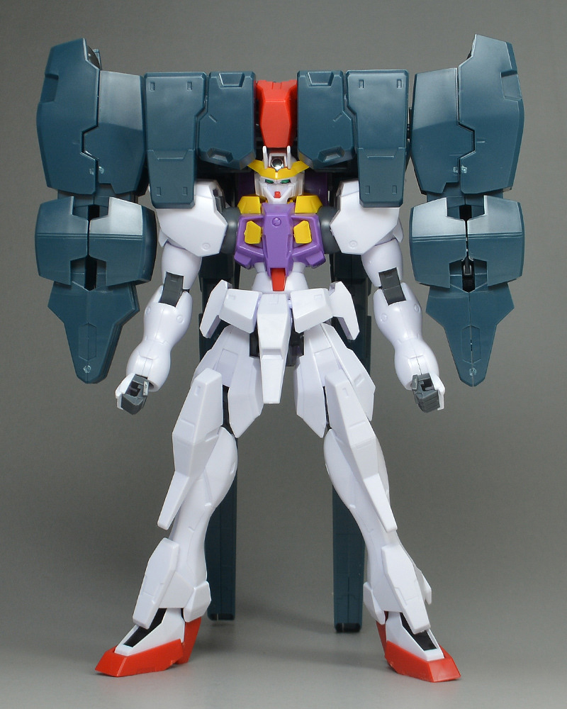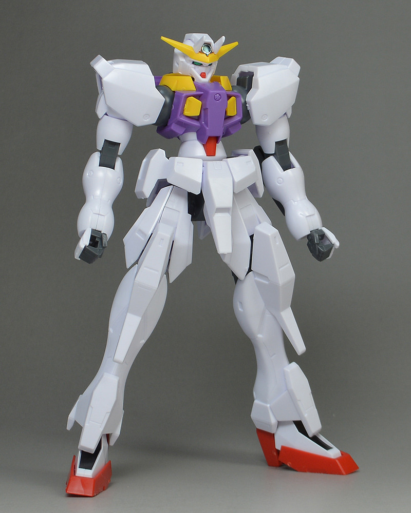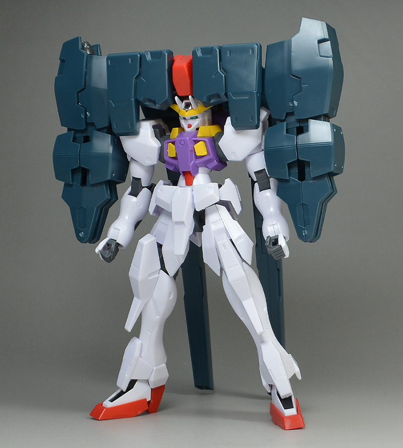 This is the third Mobile Suit Gundam 00 kit to feature Tieria Erde’s suit. Unlike the previous models, such as the Virtue and Seravee, which were thick and heavily armored, this is a slender Gundam type. The distinctive large unit on top of the head is a gigantic backpack made from reused parts from the Seravee.
