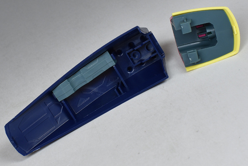 Torso. It is relatively small in size because it needs to be stored inside the skirt armor during transformation. The chest is covered with armor that is divided into colored parts, but the internal frame is exposed in the abdomen and other areas. The abdomen is a left and right sandwiched type, but is molded in stepped sections. The power pipes are separate parts and color-coded.