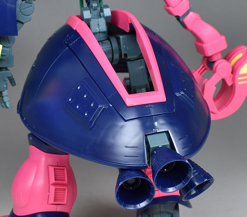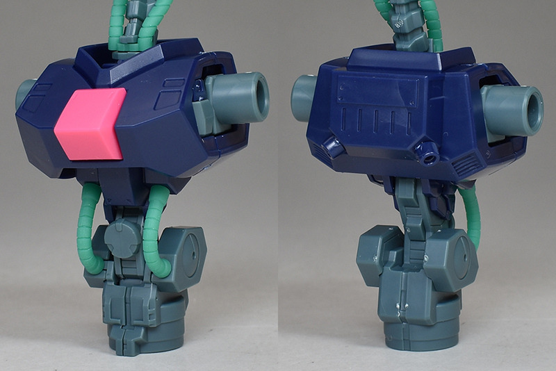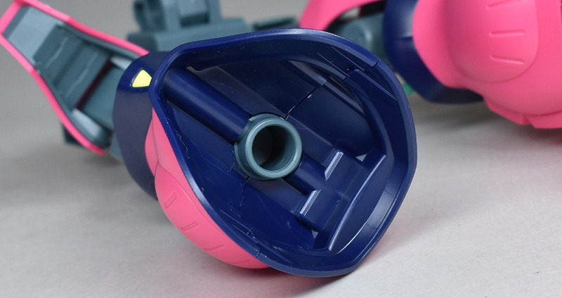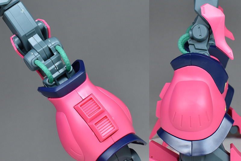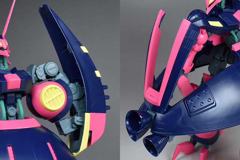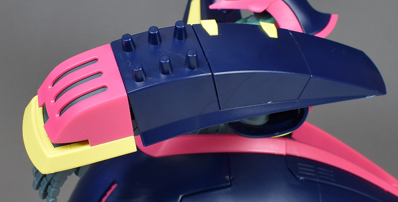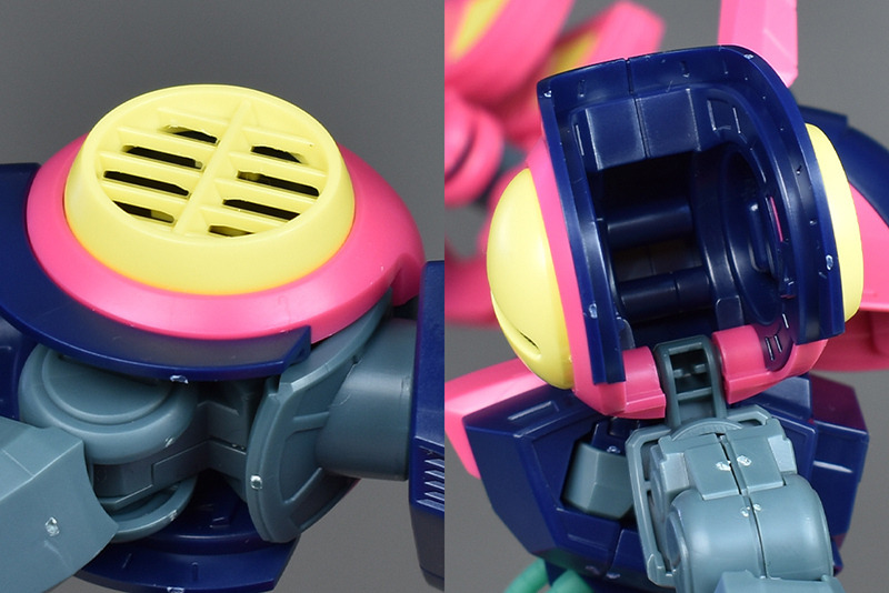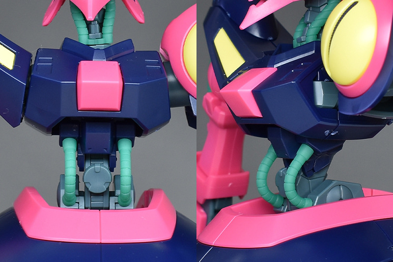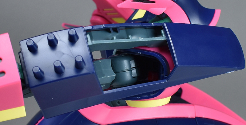 The left shoulder armor is a distinctive circular type. Each part is color-coded in detail using internal and external parts. The joints are also molded in a stepped pattern. The color coding inside the rear duct is also detailed.
