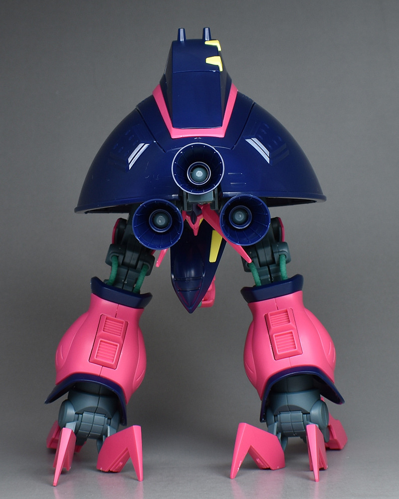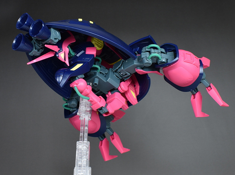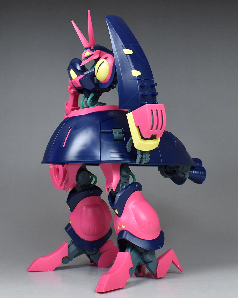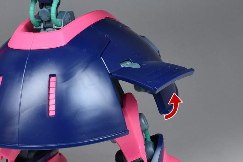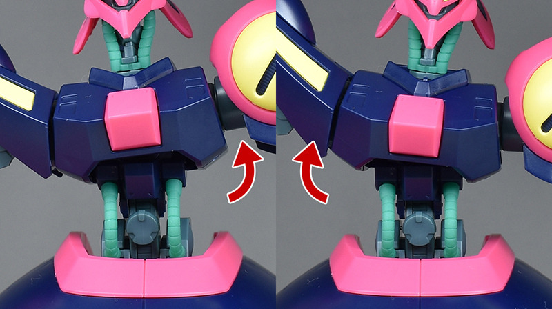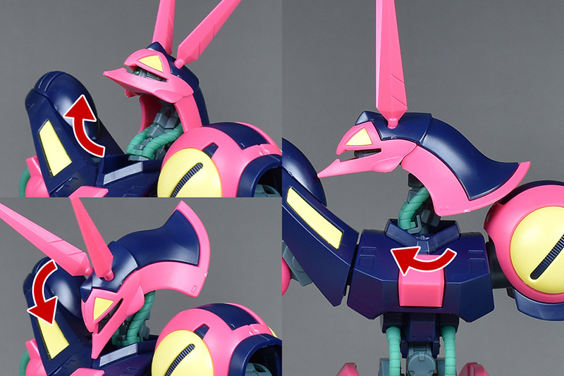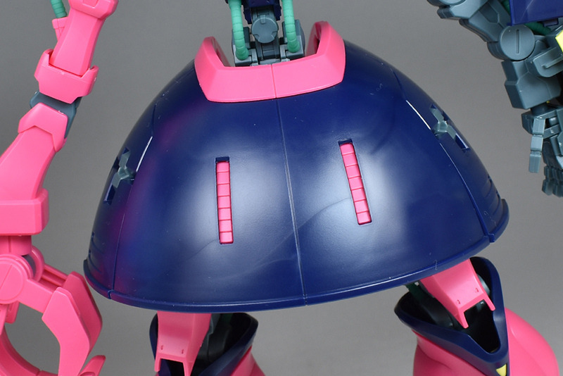The left shoulder armor is a distinctive circular type. Each part is color-coded in detail using internal and external parts. The joints are also molded in a stepped pattern. The color coding inside the rear duct is also detailed.