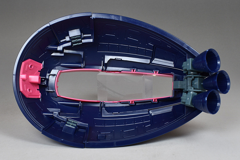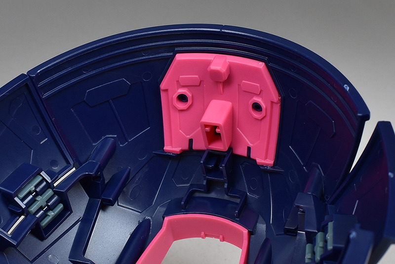 The mega particle cannon is not stored inside the shield, but is attached by removing the armor on the surface of the shield. The crank arm for deployment is also not modeled.