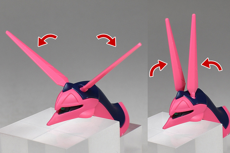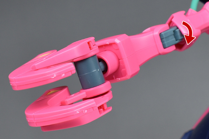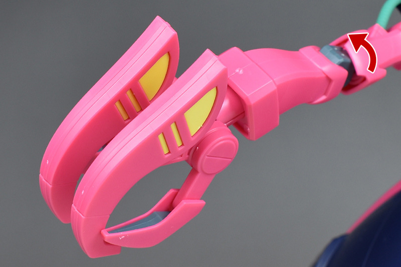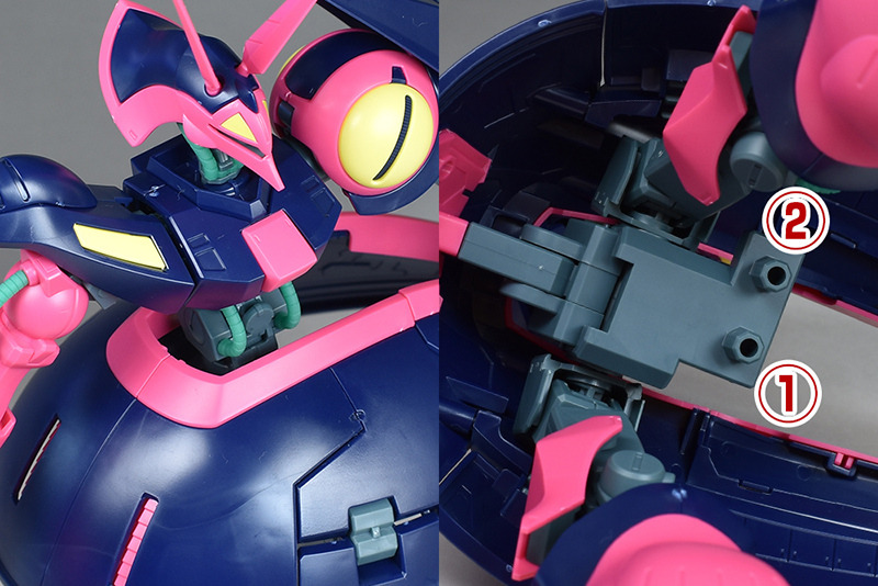 The waist can rotate 360 degrees. To display on an action base or stand, attach the included joint part to the crotch area. The joint part has two connection dowels, ① for MS mode and ② for MA mode. In MA mode, the right claw is placed in the center, so the dowel for ① is hidden, so ② is used.