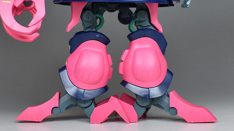 The thighs are a left and right sandwiched type, but the seams are molded with a step. The power pipes behind the knees are color-coded with green rubber parts. From the knees down, the inside is front and back, and the outside is left and right, achieving color coding by parts. The pink armor has a small front and back seam molded with a step, but the dark blue armor is a left and right sandwiched type, and has seams on the sides. It can be separated from the knees, so it should be easy to remove the seams.