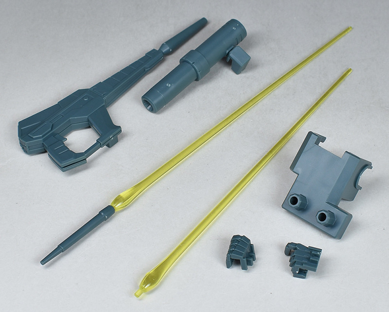 Includes a beam rifle, a mega particle cannon, a beam saber blade (handle, blade), various finger parts (for holding the beam rifle, for gripping hands), and joint parts for display. One beam saber blade is included as an extra.