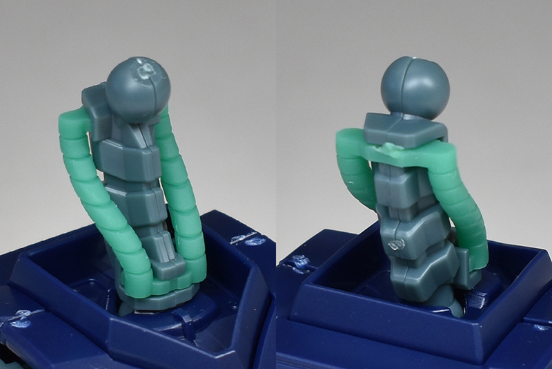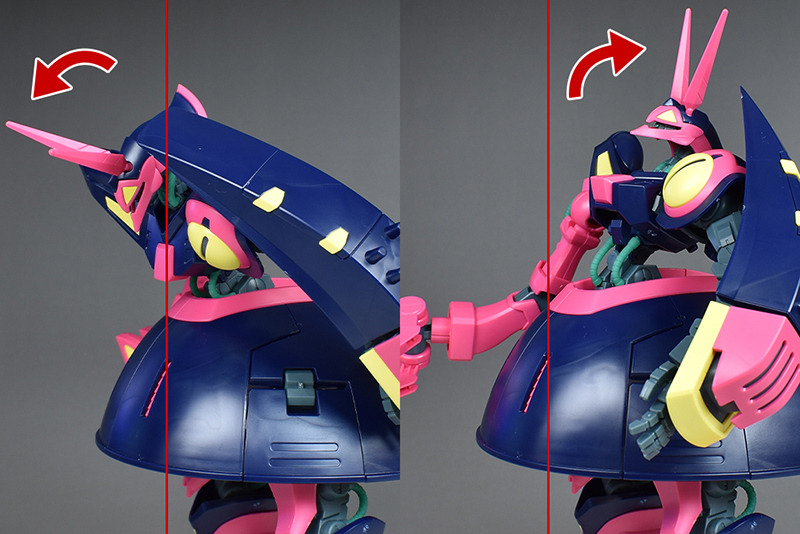 Then, deploy the rear thrusters and armor, turn the head to the side, and store the upper body inside the waist skirt armor. The head antenna is prone to interference when storing, so be careful not to damage it. If this is difficult, it may be a good idea to remove the antenna before storing it.