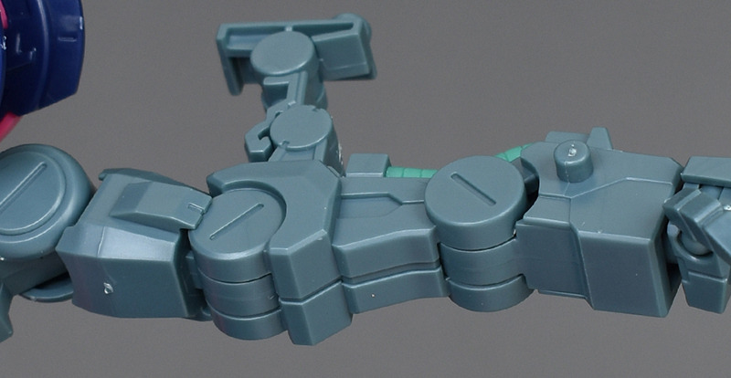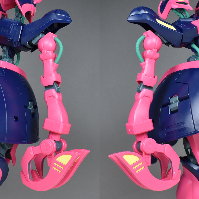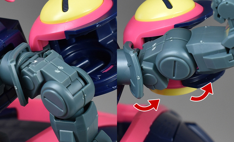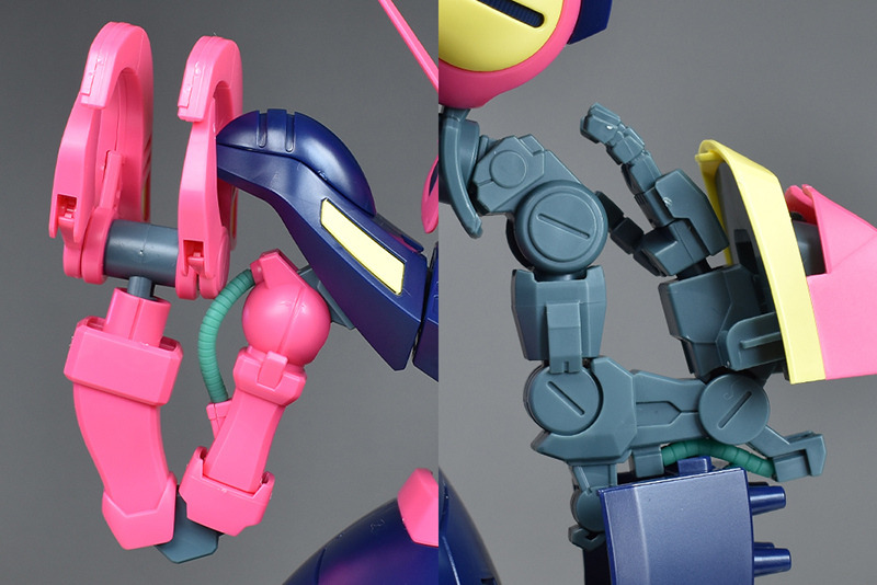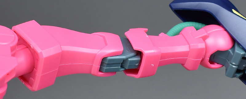The upper arms are integrated with the shoulder armor, so there is no rotational movement at the joints. The outer power pipes are separate parts with different colors. Both the upper arms and forearms are clamped together to create a seam. They can be separated from the elbows, but the forearms and elbow joints cannot be separated, so if you want to remove the seam, you will need to insert the power pipes back into the upper arms as well.