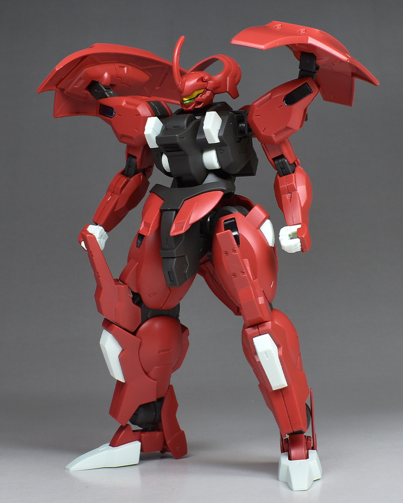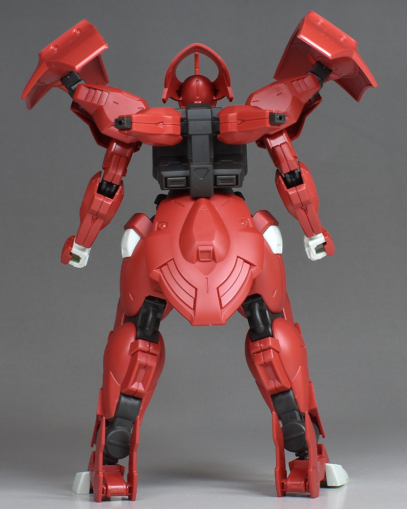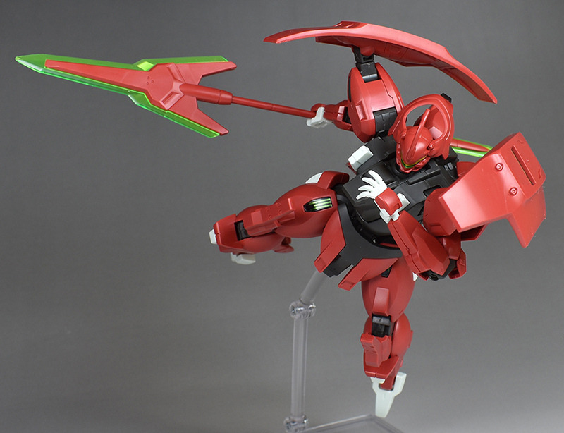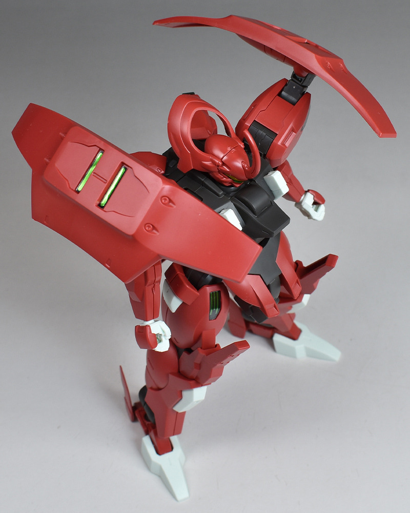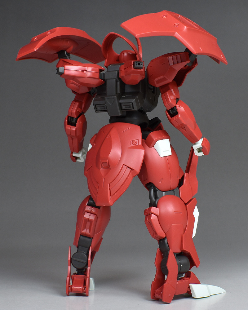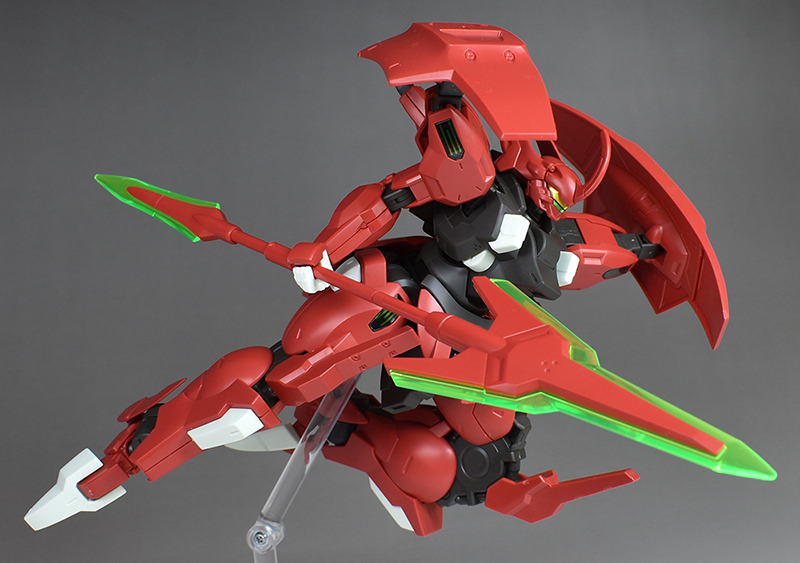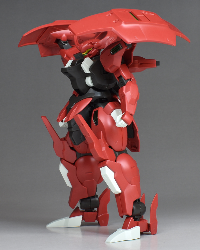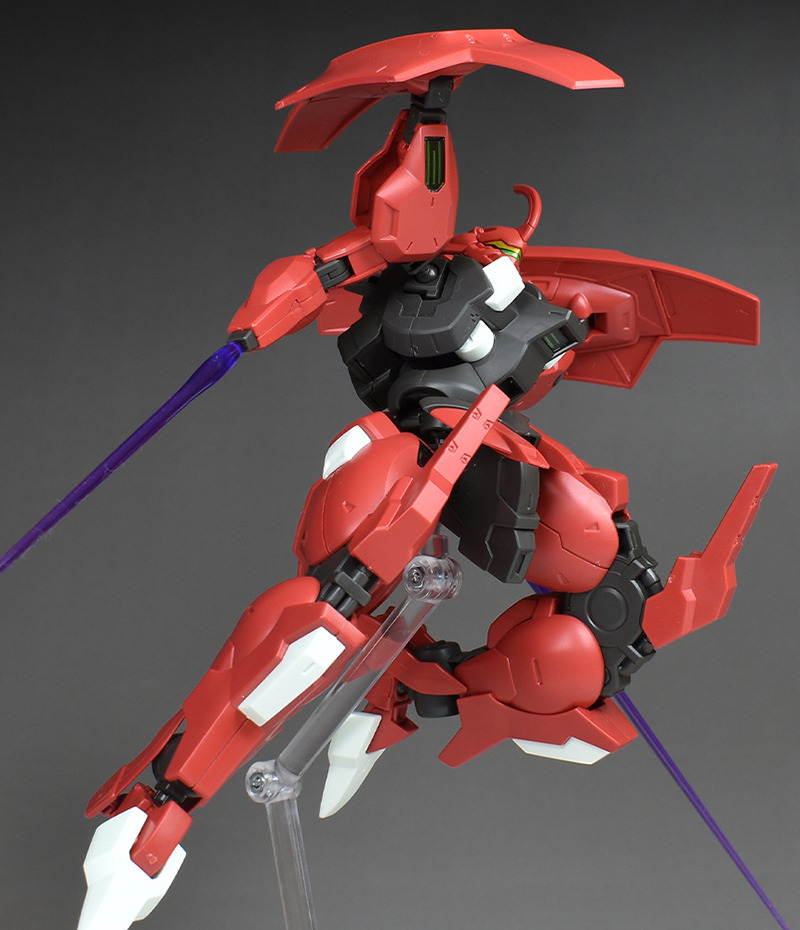 Although the red coloring is not unusual for Gundam, the red fuselage still has an impact, and the included armament with its many variations, such as the Ishvira, Shackle Crow, and Beam Javelin, is quite playful. The shoulder ambiker also has a strong presence, and is one of the items that gives a sense of sculptural beauty even when posed.