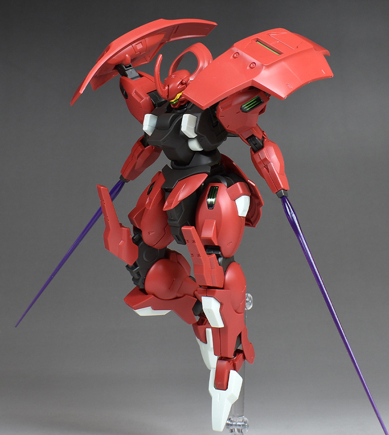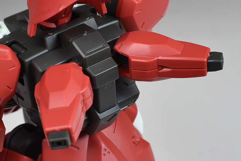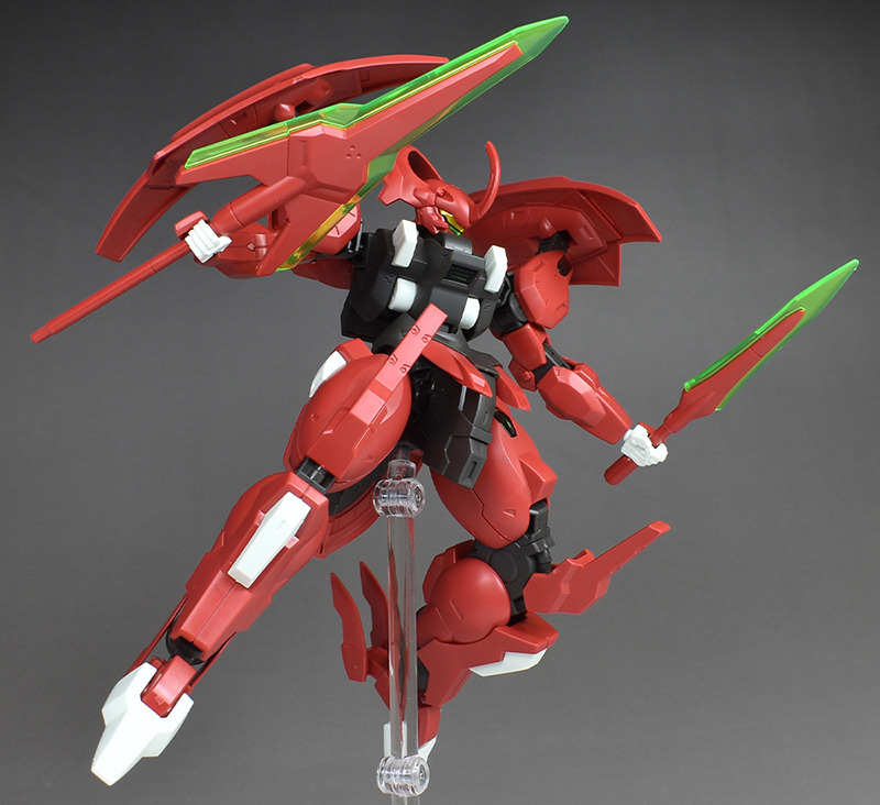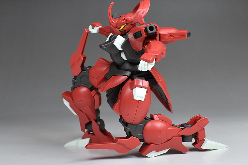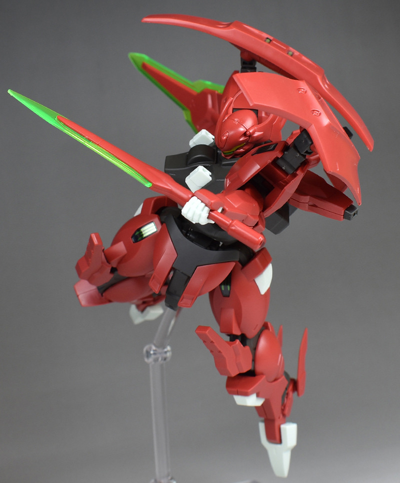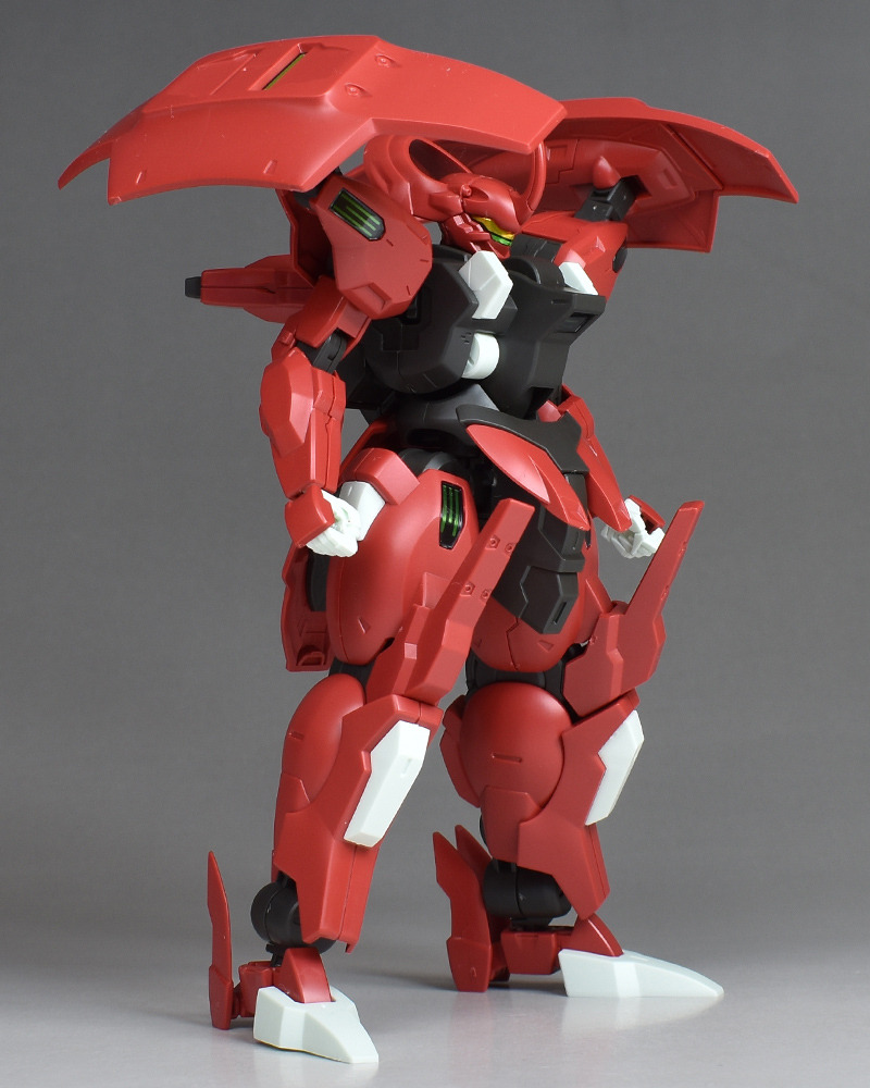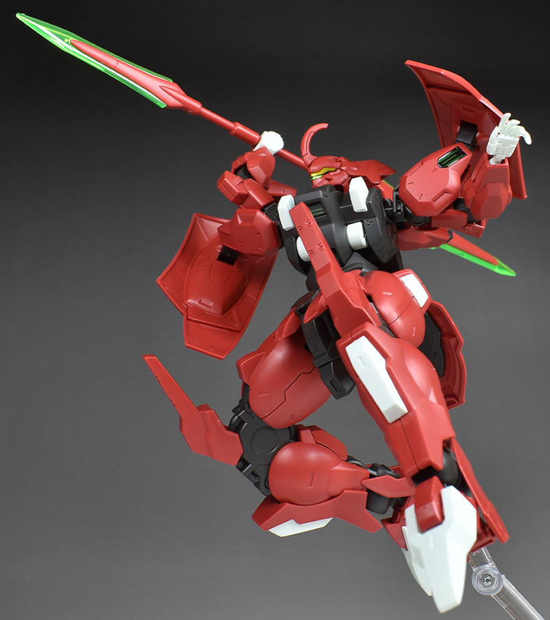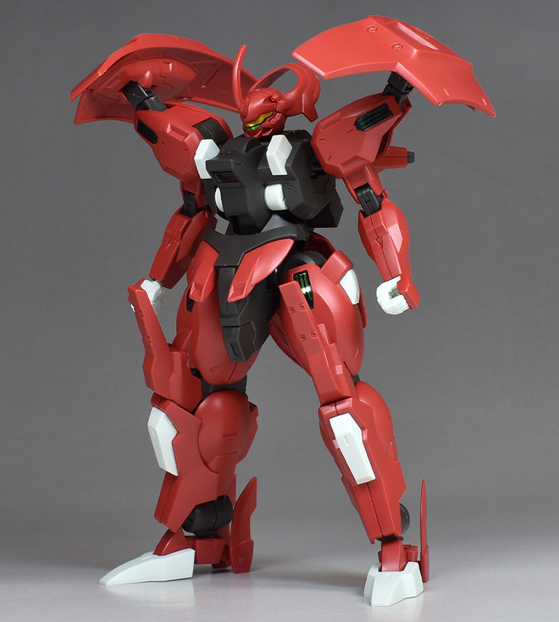 Although the red coloring is not unusual for Gundam, the red fuselage still has an impact, and the included armament with its many variations, such as the Ishvira, Shackle Crow, and Beam Javelin, is quite playful. The shoulder ambiker also has a strong presence, and is one of the items that gives a sense of sculptural beauty even when posed.