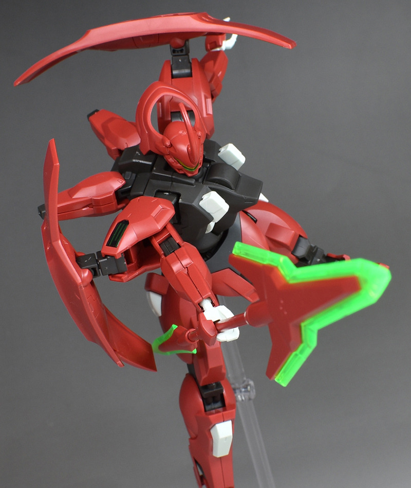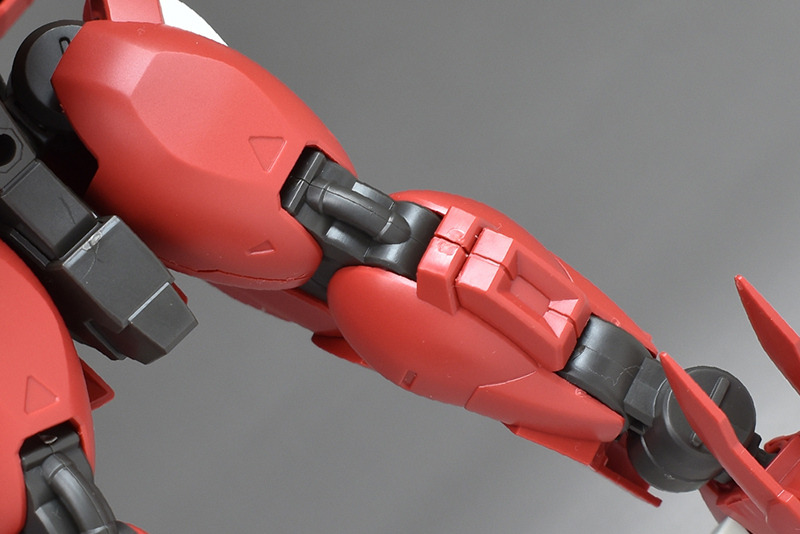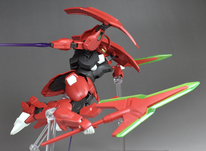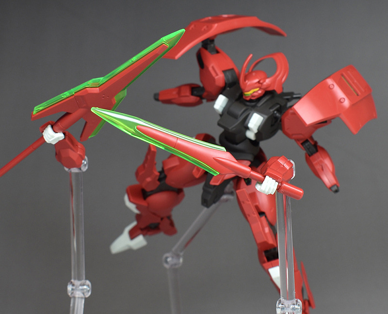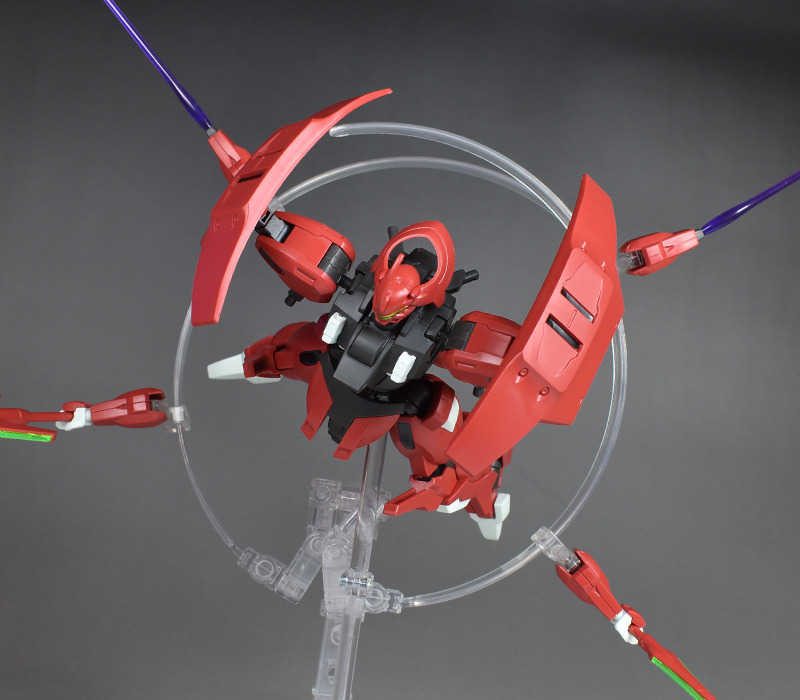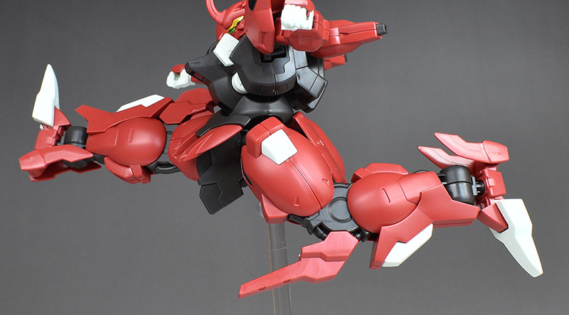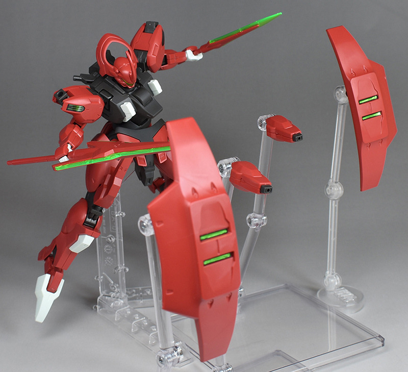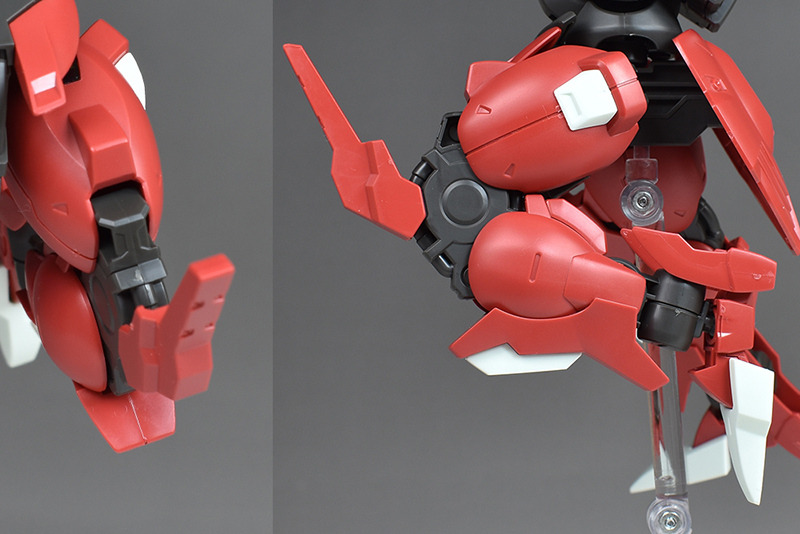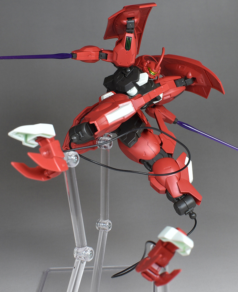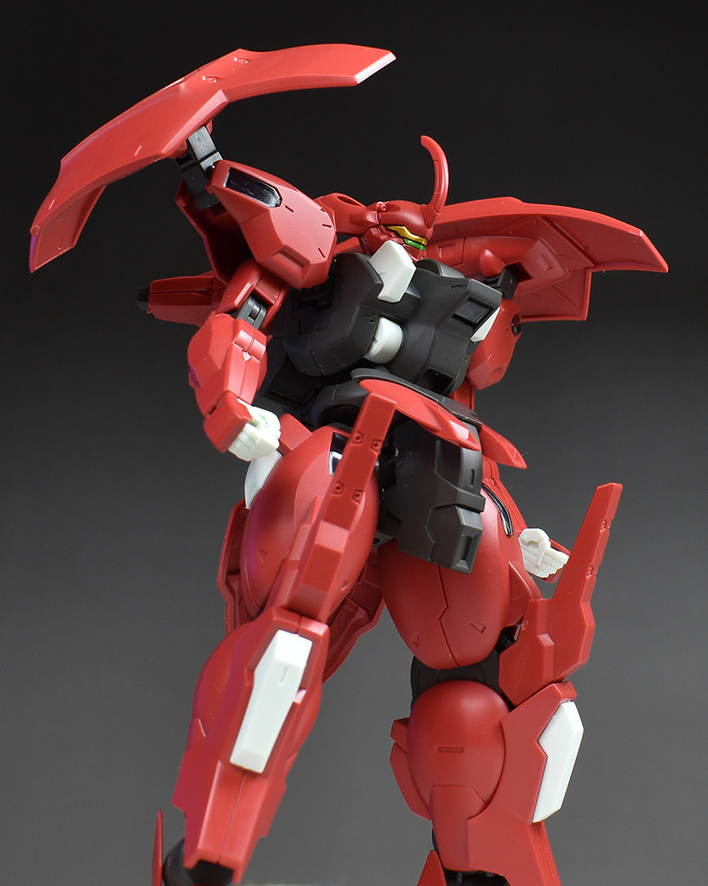 Although the red coloring is not unusual for Gundam, the red fuselage still has an impact, and the included armament with its many variations, such as the Ishvira, Shackle Crow, and Beam Javelin, is quite playful. The shoulder ambiker also has a strong presence, and is one of the items that gives a sense of sculptural beauty even when posed.